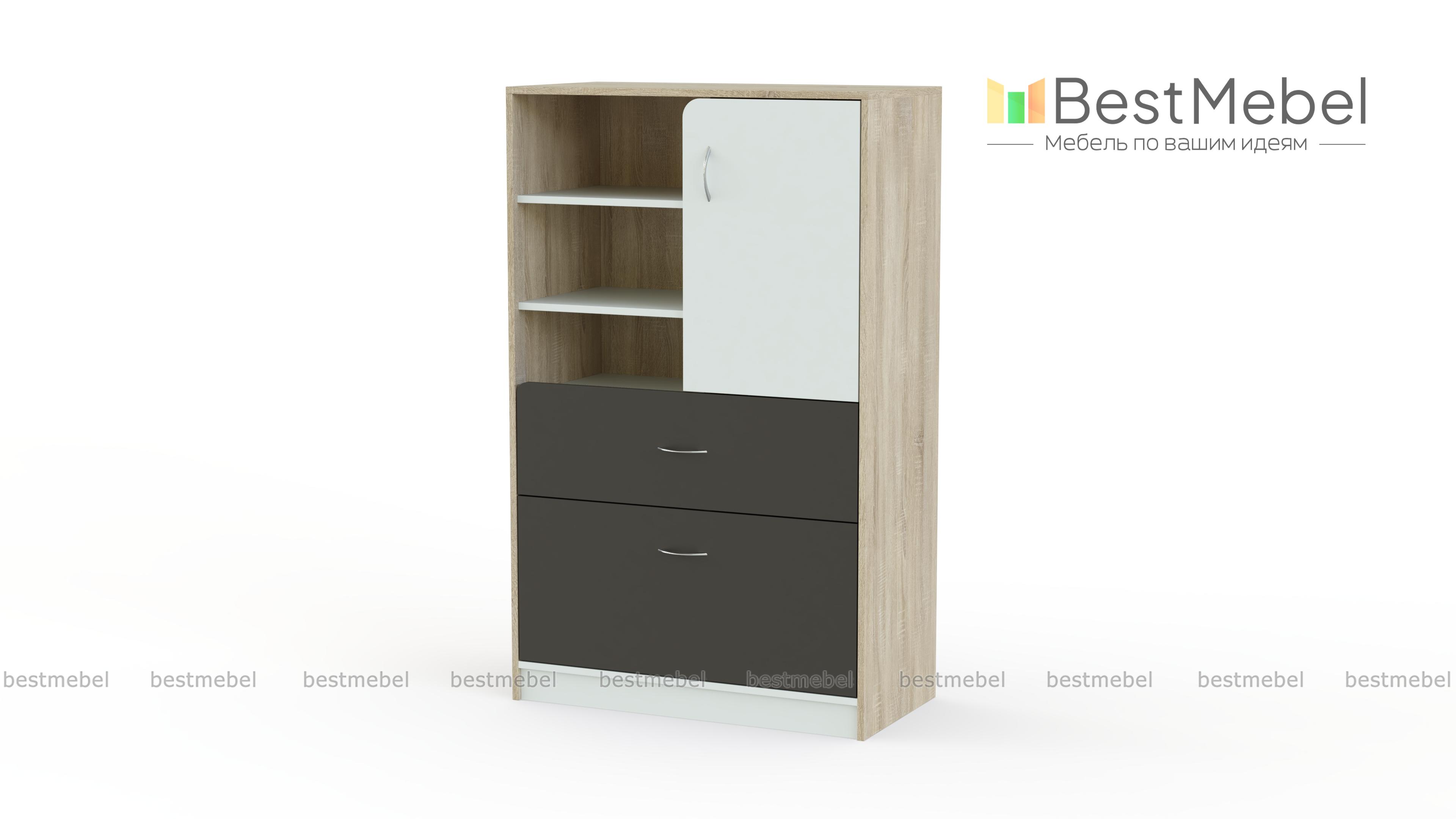 Комод IQ-07 BMS – высокая модель, объединившая функции классического комода и книжного шкафа. Прекрасный выбор для интерьера детской, комод выполнен в сочетании нейтральных оттенков с яркими вставками и оборудован всем необходимым для хранения игрушек, книг, разнообразных мелочей. В нижней части модели располагаются два выдвижных ящика разной глубины, в верхней – распашное отделение и открытые полки. Износостойкие и простые в уходе, поверхности надолго сохранят эстетичный вид. Купить комод IQ-07 BMS приглашаем в наш интернет-магазин.