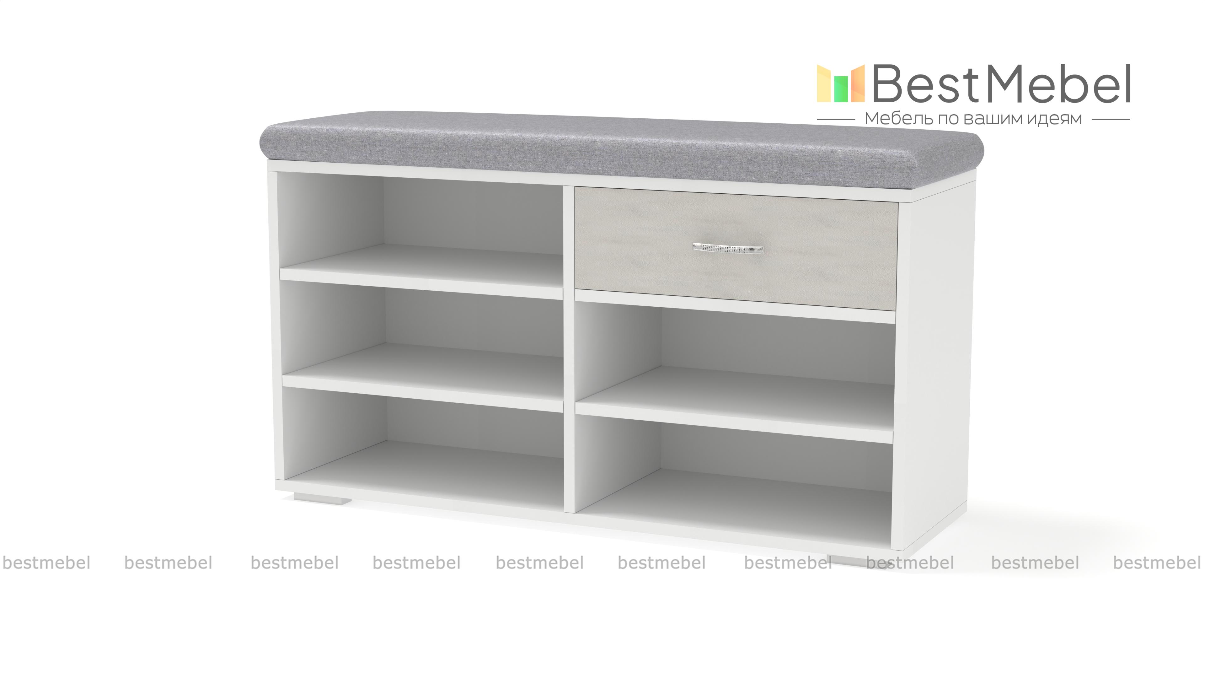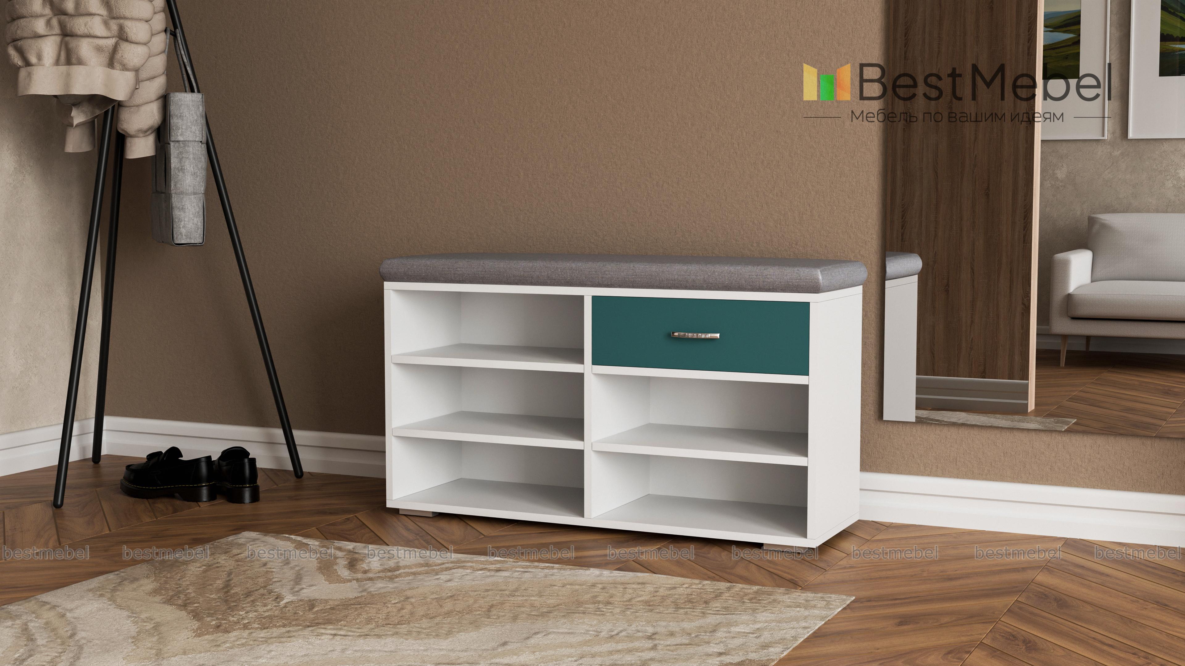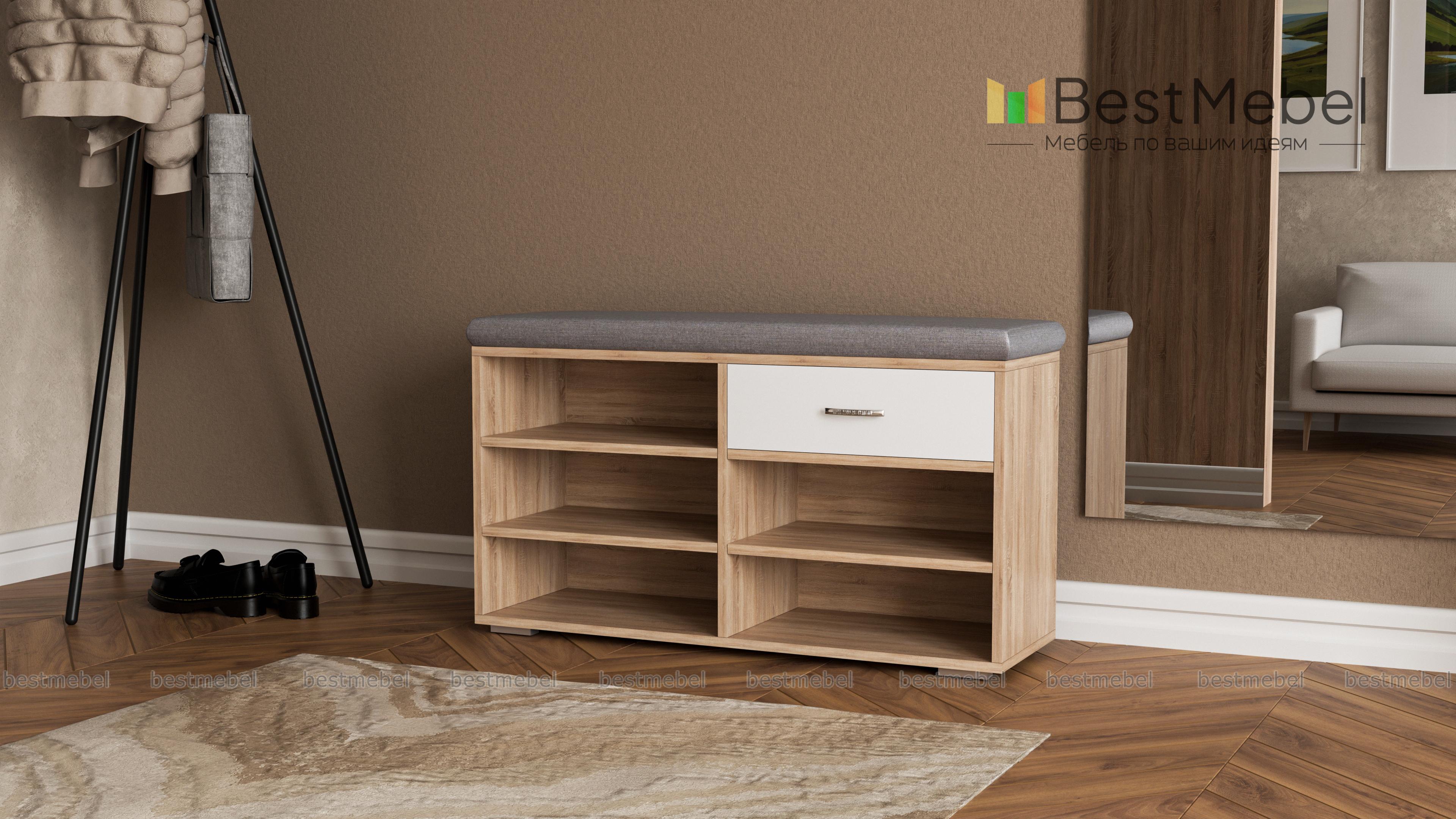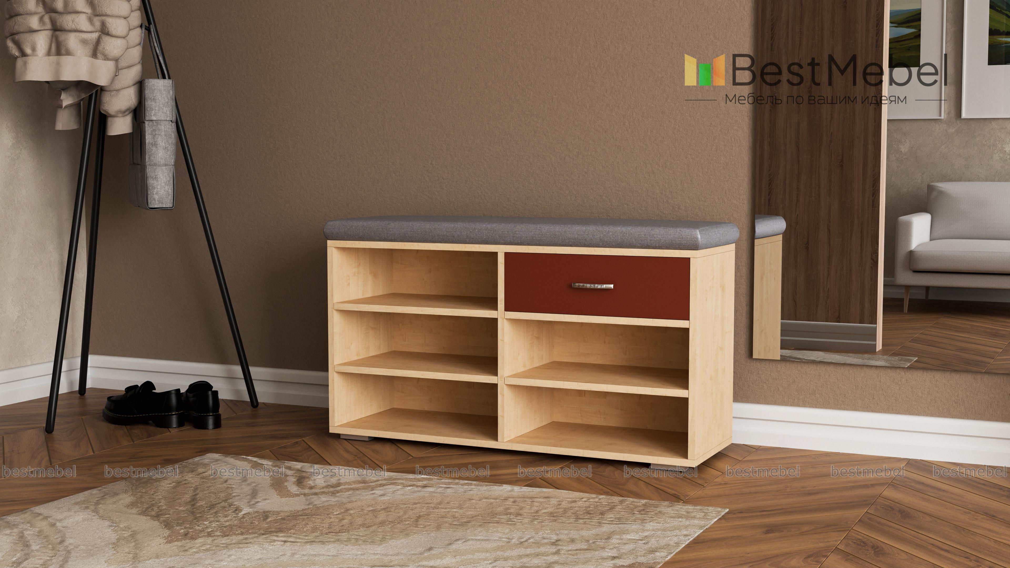 Отличная обувница, сразу мне приглянулась, потому что несколько полочек для обуви, чтобы ничего не мешалось при входе+ удобный ящик для мелочи. На сайте большой выбор материалов и расцветок сидушки. Обувница была частью от заказа в прихожую №00000667194 (Э667194).
