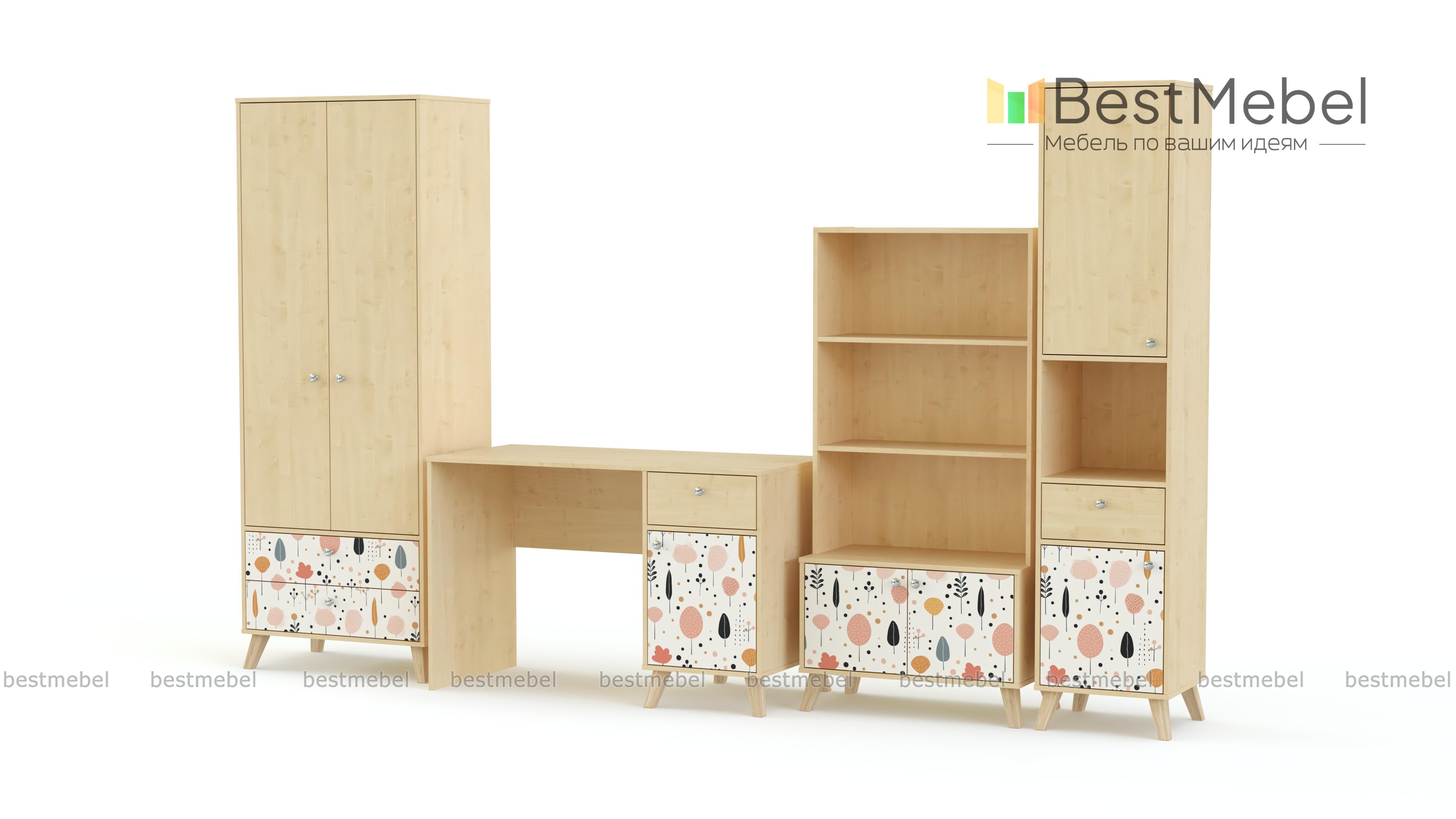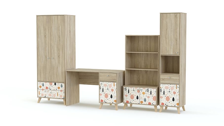 Детская комната Эльза 8 BMS включает в себя все необходимое для обустройства рабочей зоны и комфортной системы хранения. В комплекте письменный стол с тумбой, два комбинированных книжных стеллажа и шкаф для одежды с ящиками. Все предметы оборудованы высокими сканди-ножками и выполнены в теплой древесной гамме, фасады украшены фотопечатью пастельных тонов. Купить детскую комнату Эльза 8 BMS вы сможете в нашем интернет-магазине, самостоятельно подобрав размеры, ручки и цвет.