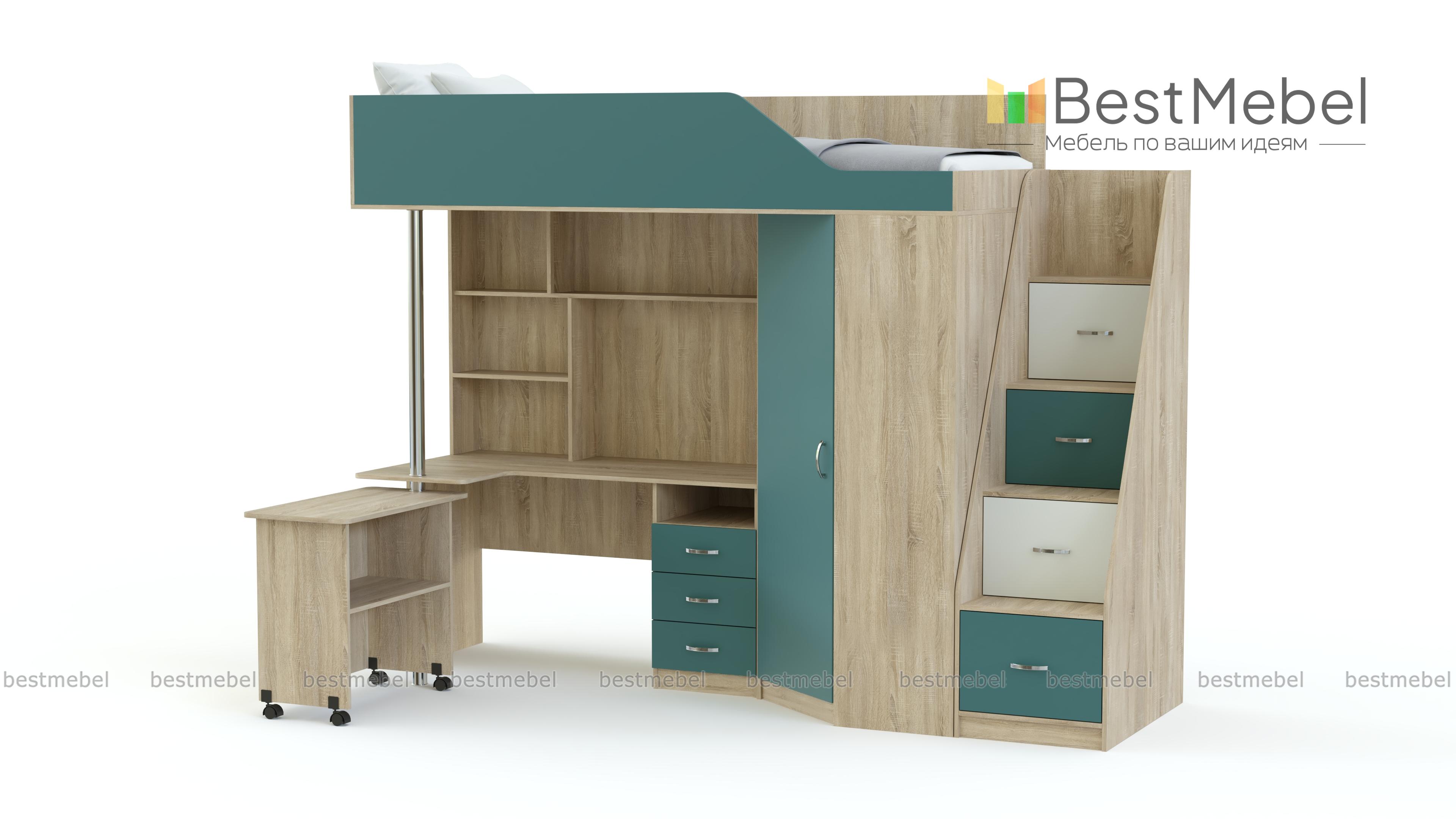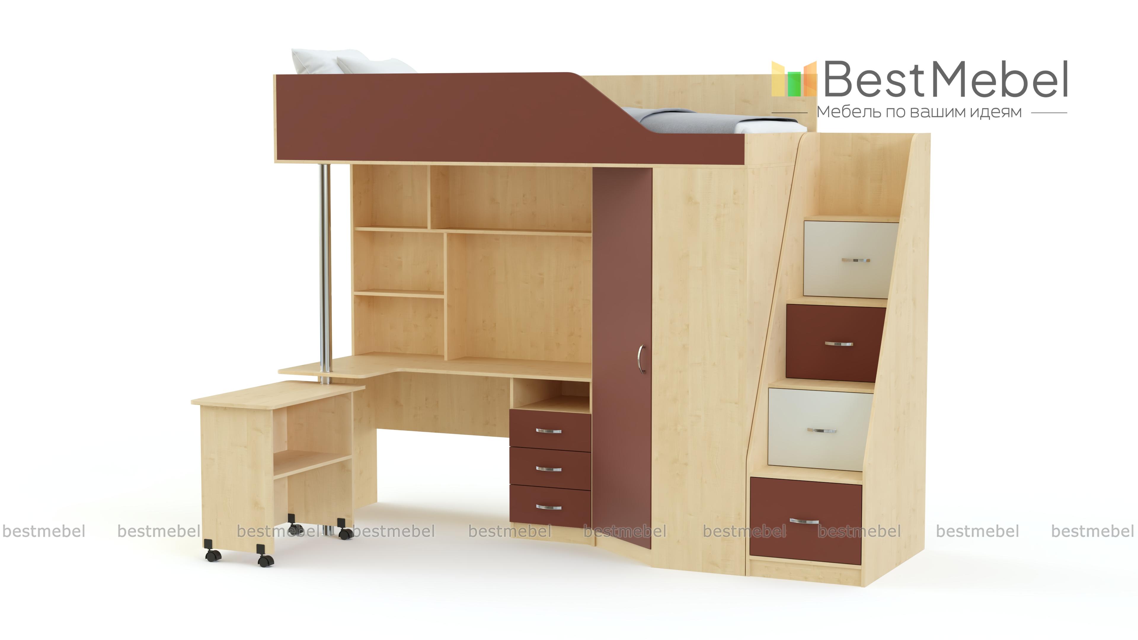 Детская кровать-чердак Мерабель 1 BMS – отличная модель с потрясающей функциональностью. В комплект входят все элементы, необходимые для гармоничного развития малыша. Большой шкаф интересной формы вместит кучу детских вещей. На спальное место, скрытое за фигурной панелью, нужно забираться по надежной лестнице – тумбе. Её вместительные ступени станут домом для многочисленных игрушек и прочих детских богатств. Рабочий стол имеет полный арсенал для полноценного учебного процесса: это и полочки для книг, и тумба с ящиками для тетрадок и канцелярских мелочей. Обратите внимание на пристройку к столу, которая легко крутится на никелированной опоре, при необходимости увеличивая рабочую поверхность стола почти вдвое. Ребенок с удовольствием будет раскладывать свои вещи по полочкам, поддерживая порядок в своем собственном мирке. Купить детскую кровать – чердак Мерабель 1 BMS по минимальной цене можно на нашем сайте.