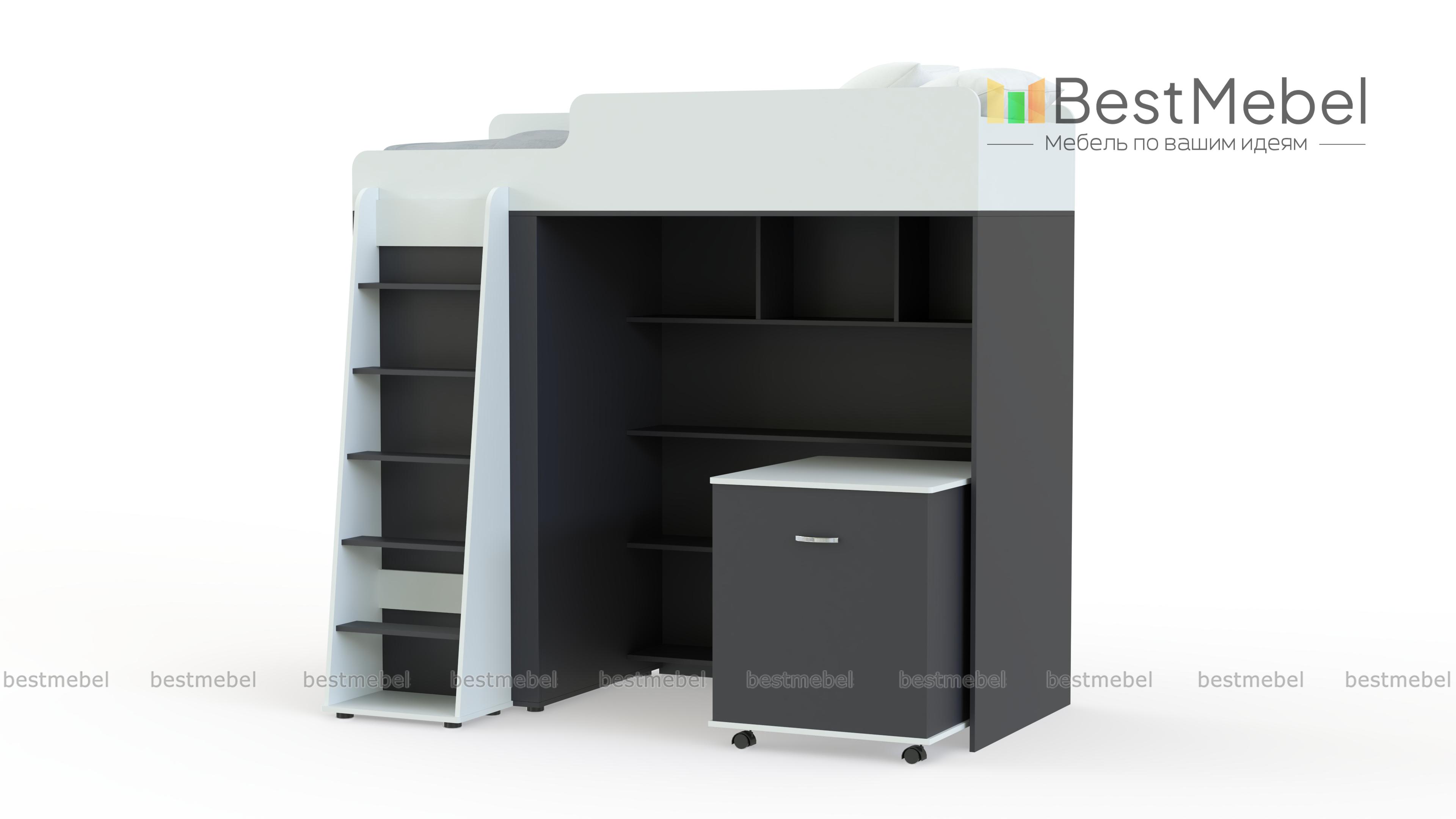Кровать-чердак Миф-5 BMS представляет собой практичную модульную композицию, незаменимую в малогабаритных помещениях. Спальное место второго яруса оборудовано скругленными защитными бортиками и дополнено приставной устойчивой лестницей. В нише первого яруса располагаются открытые книжные полки и тумба, а с торца разместился шкаф для одежды. Выполненная в сочетании светлых древесных тонов и белых вставок, кровать гармонично дополнит интерьер детской и порадует ребенка. Купить кровать-чердак Миф-5 BMS приглашаем в наш интернет-магазин по отличной цене.