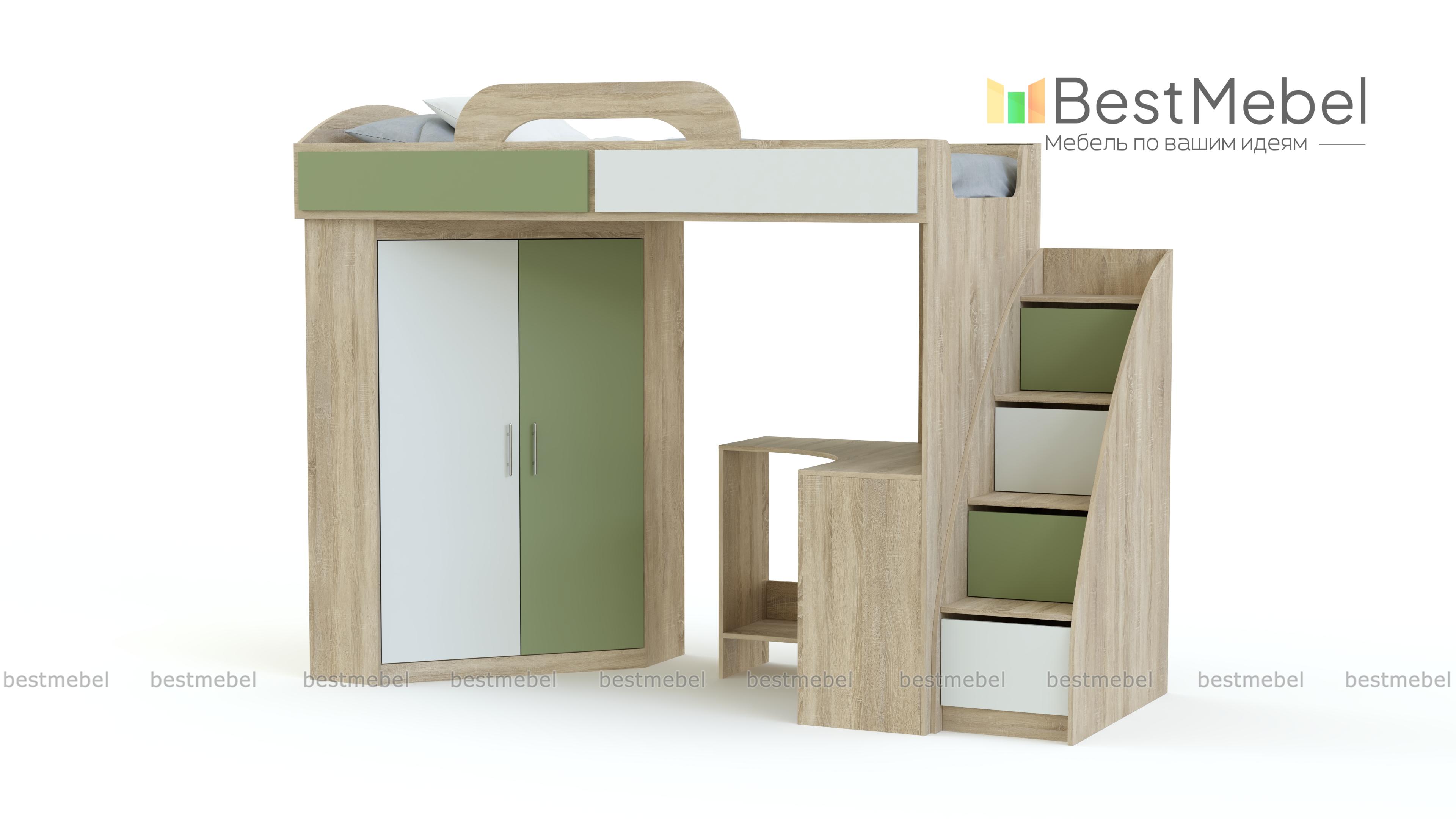 Кровать-чердак со шкафом и столом Фимо 2 BMS поможет вам создать визуально легкий и функциональный интерьер. Двухъярусная композиция включает в себя все необходимое ребенку для комфортного сна, учебы и хранения вещей – спальное место с бортиком и практичной лестницей-комодом, платяной шкаф-трапецию и угловой компьютерный столик с полкой и подставкой под монитор. Матовые фасады просты в уходе и надолго сохранят эстетичный вид. Купить кровать-чердак со шкафом и столом Фимо 2 BMS и сэкономить пространство вам поможет наш интернет-магазин.