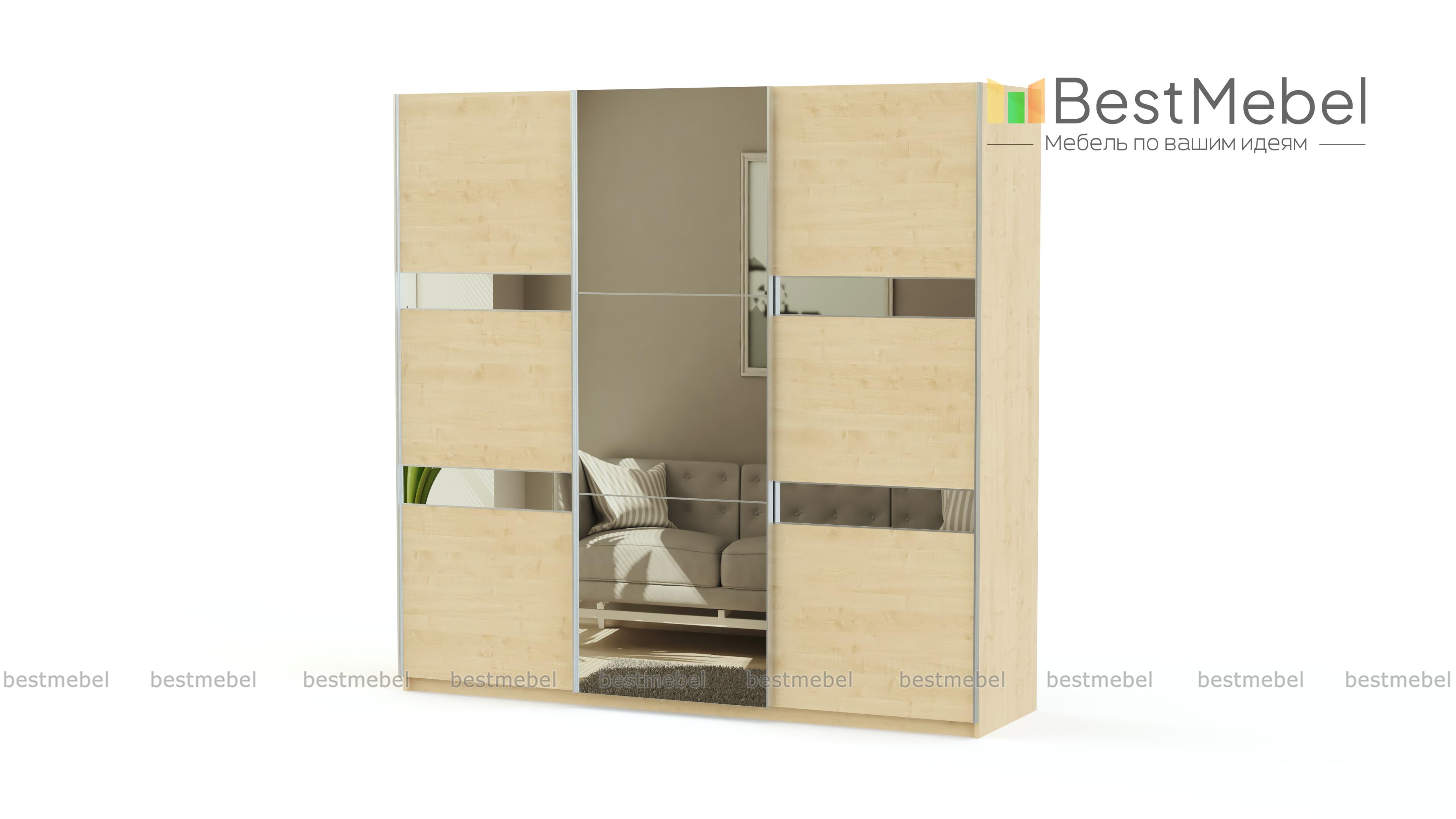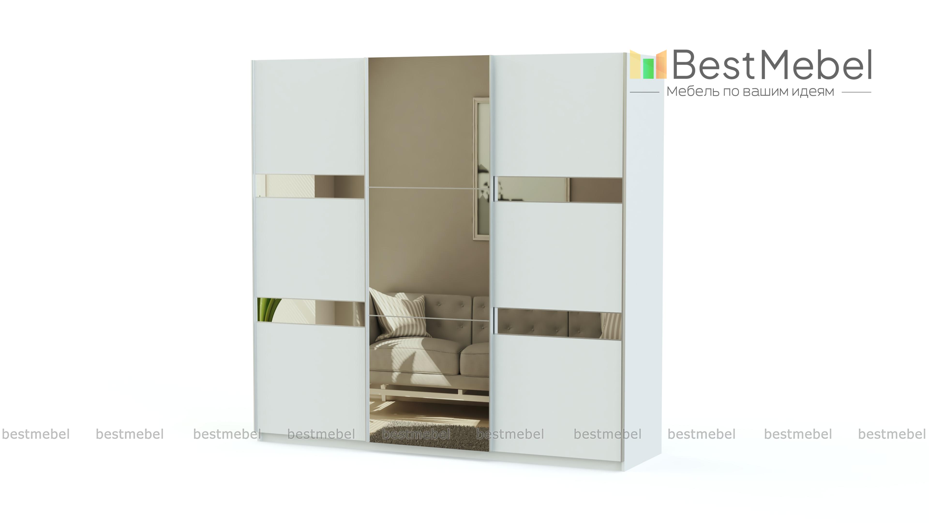 Современный шкаф-купе с оригинальным дизайном. Трехдверный фасад с горизонтальным делением выделен контрастными цветами и зеркалами. Такой шкаф будет одинаково хорошо смотреться в гостиной и прихожей. Конструкция предусматривает наличие вместительных полок, отделений со штангами и 4 выдвижных ящиков для хранения мелких вещей. Здесь найдется место для верхней одежды, платьев и сорочек, постельного белья, дорожных сумок, коробов, зонтов и многого другого, что часто загромождает углы квартиры.