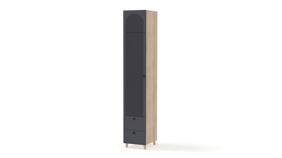 Шкаф-пенал Рене 14 BMS предлагает для хранения не только стандартное распашное отделение, но и два выдвижных ящика снизу, а также антресоль. Продуманная комплектация позволяет легко поддерживать порядок в вещах, а размеры пенала оптимальны для комнат малого метража. Для стильного вида — темный рифленый фасад с круглыми ручками и высокие опоры оттенка светлого дерева. Купить шкаф-пенал Рене 14 BMS, изготовленный по вашим размерам, приглашаем на сайт нашего интернет-магазина.