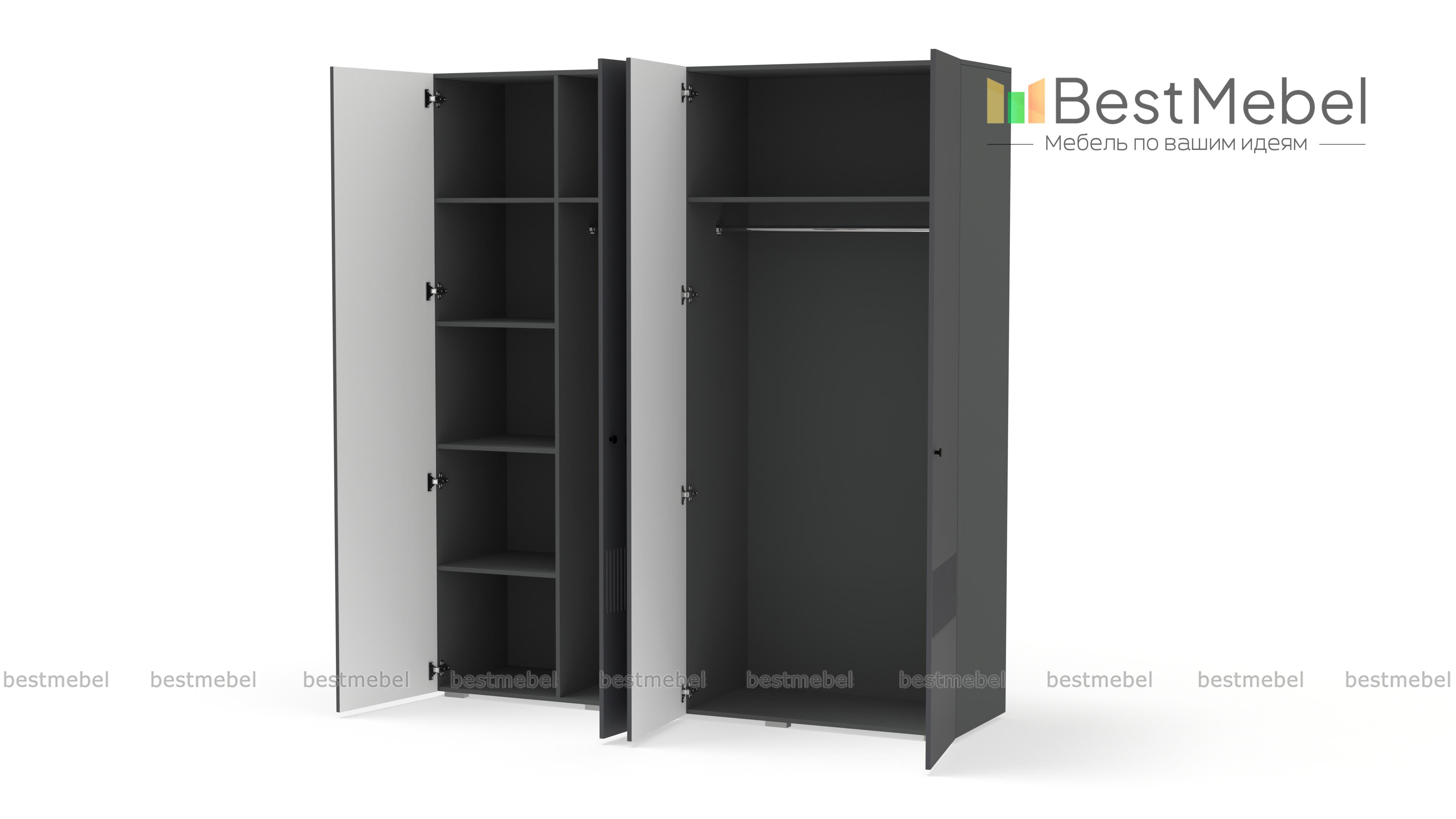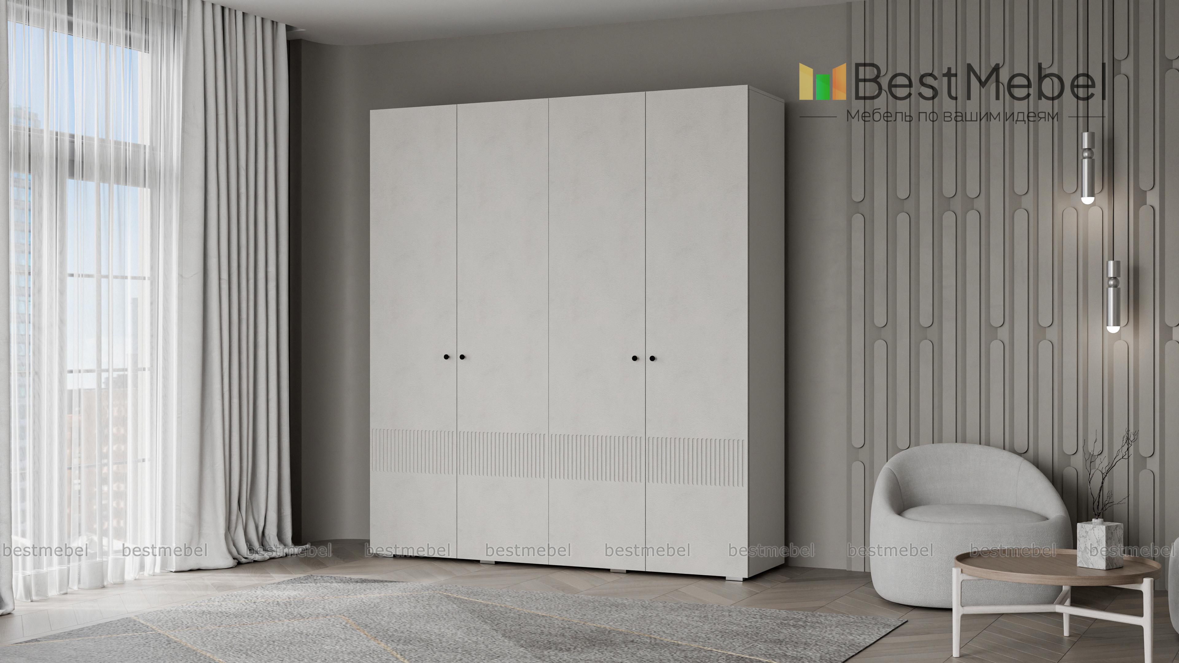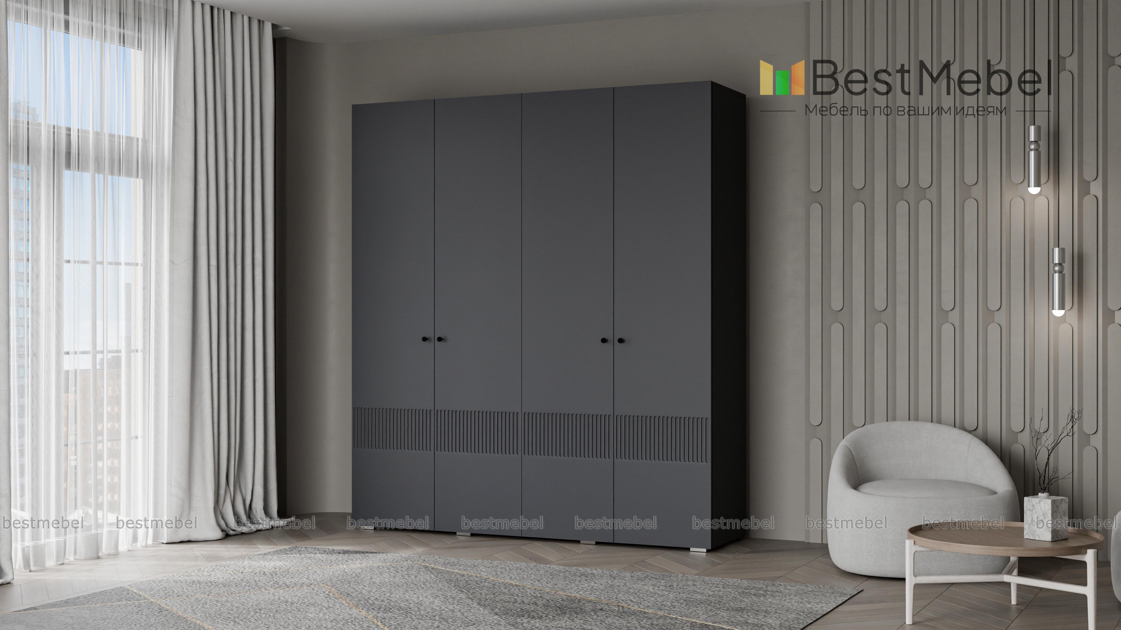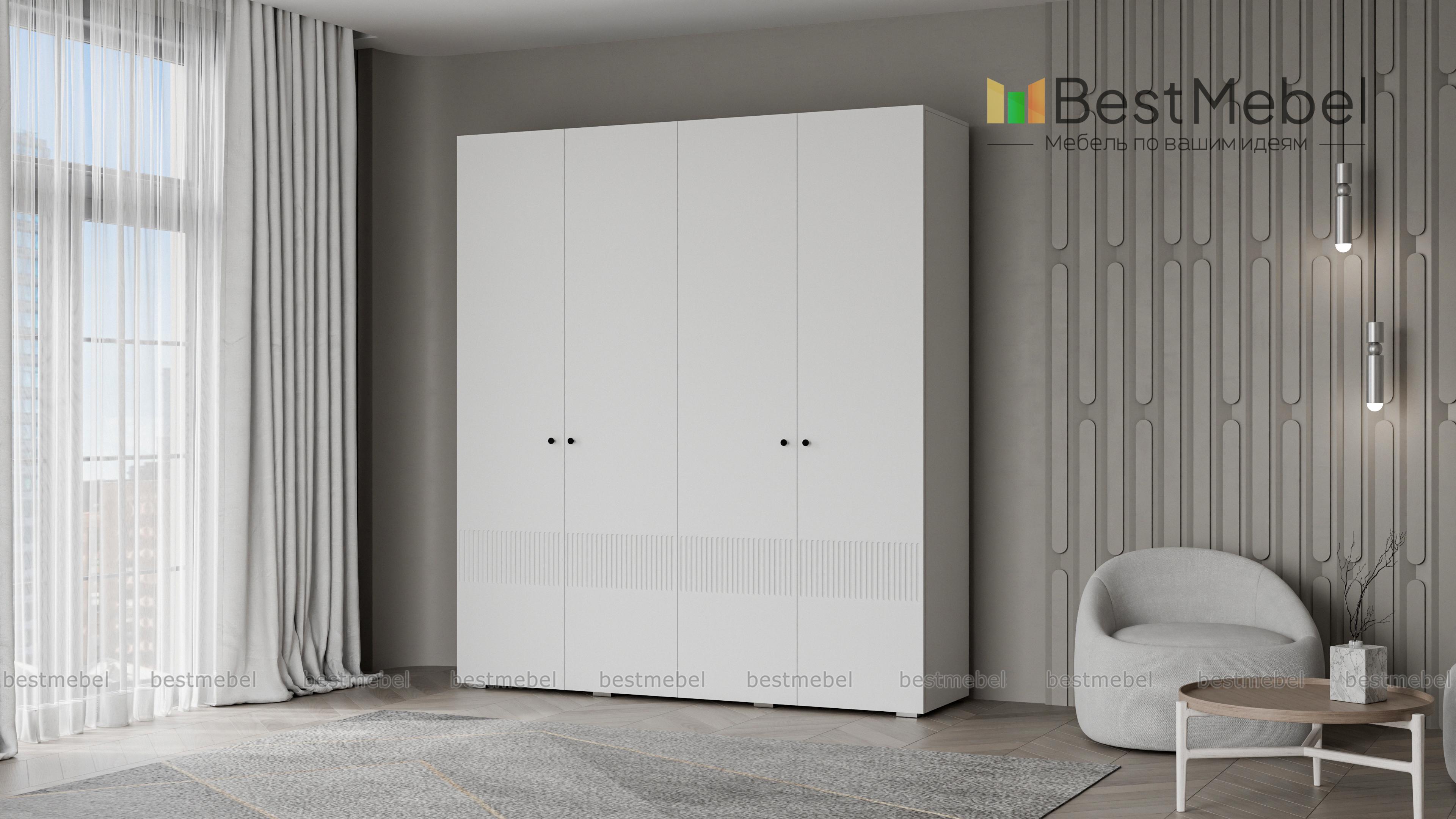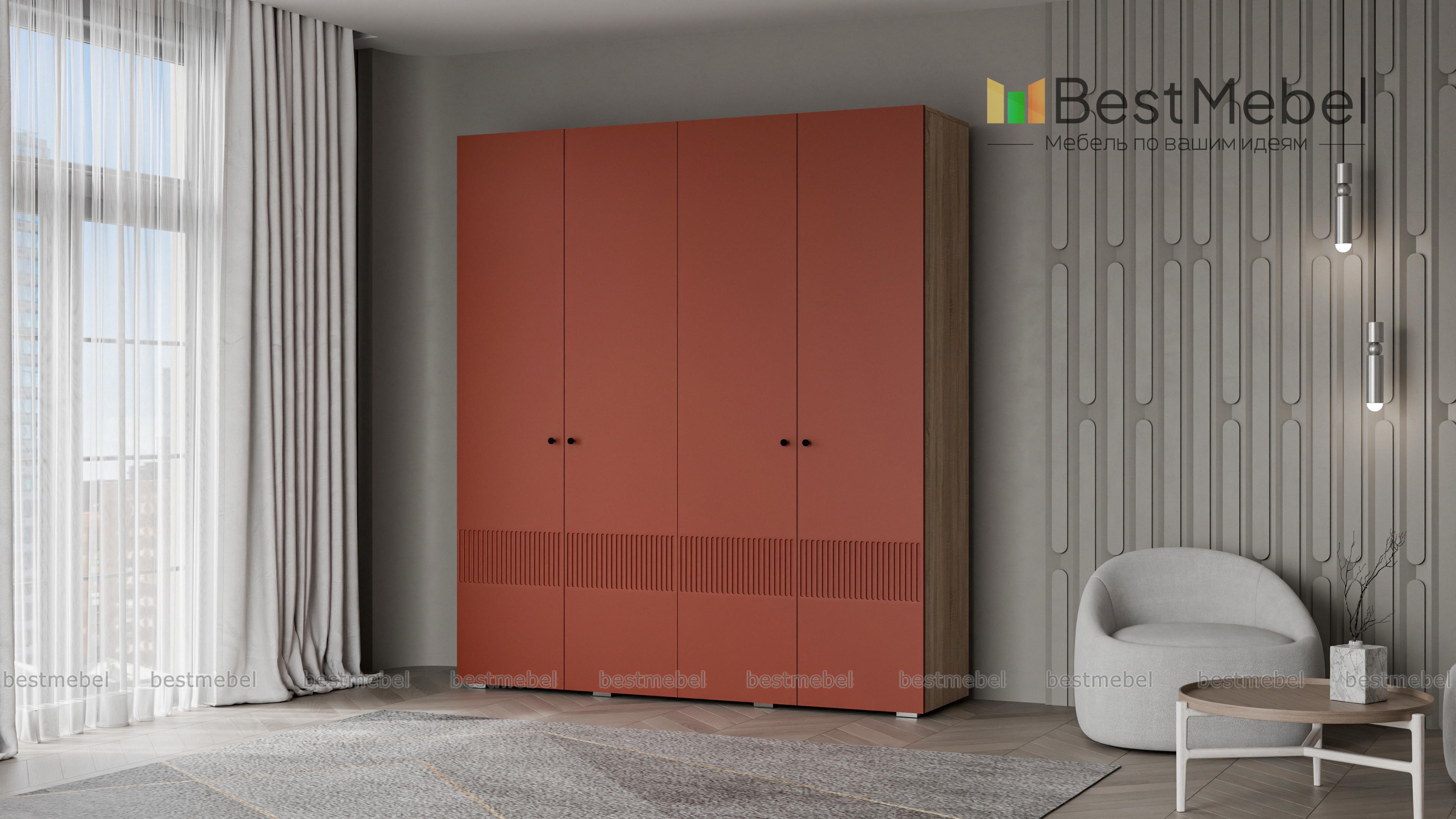 Шкаф распашной Джосс 4 BMS — практичная и стильная четырехдверная модель в прихожую, детскую или спальню. Два отделения со штангами и ряд полок слева помогут вам расположить вещи по категориям — от верхней одежды до трикотажа. Акцентный цветной фасад гардероба украшает фрезеровка, на дверцах установлены миниатюрные круглые ручки. Купить шкаф распашной Джосс 4 BMS вы сможете в нашем интернет-магазине, изменив по желанию размеры, тип ручек и цветовую гамму.