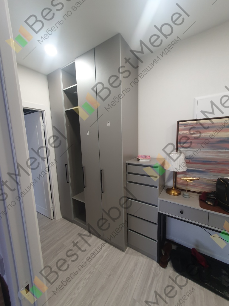 Шкаф распашной Остин Лайт 3 BMS (1860х2490х550), заказ 00000204766. Делали ремонт в коридоре и необходимо было заменить два шкафа, прихожую и дверцы на антресолях. Всё заказали здесь. Увидели на сайте этот шкаф и поняли - это то, что искали. Самостоятельно поменяли размеры, цвет фасадов (Тэффи L) и цвет самого шкафа (серый), кромку лицевых частей на 2 мм. ручки оставили эти (понравились), петли поменяли на Блюмовские с доводчиками. Внутри не меняли, был как надо. Середина - штанга и две полки (сверху и снизу), по бокам полки. Получился очень большой и вместительный шкаф. После оформления заказа на сайте, перезвонила менеджер (минут через 20), еще раз всё уточнила и перепроверила, помогла с точными размерами, чтобы шкаф точно встал в нишу. Всё изготовили быстро. Позвонили и согласовали день доставки. Доставка хорошая, оформляли с поднятием в квартиру. Комплектация полная, всё целое. Выдали документы с гарантией и телефоном компании по сборке. Позвонили туда и через час с нами связался сборщик, согласовали уже с ним дату и время. Отличный парень по сборке мебели. Собрал нам сразу два шкафа и прихожую за 4 часа. Спасибо, что появился такой интернет-магазин! Цена шкафа намного ниже, чем заказывать в компаниях по изготовлению мебели на заказ (узнавали в 5 компаниях) и сроки изготовления в несколько раз быстрее. Спасибо, что появился такой интернет-магазин!