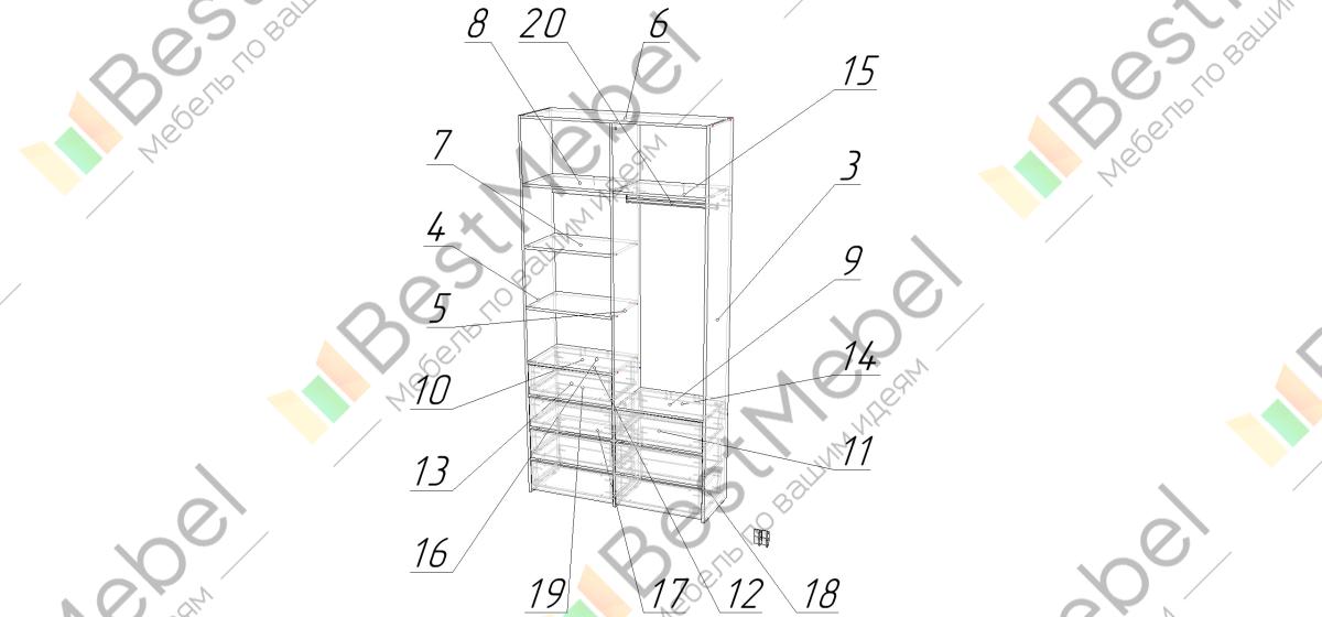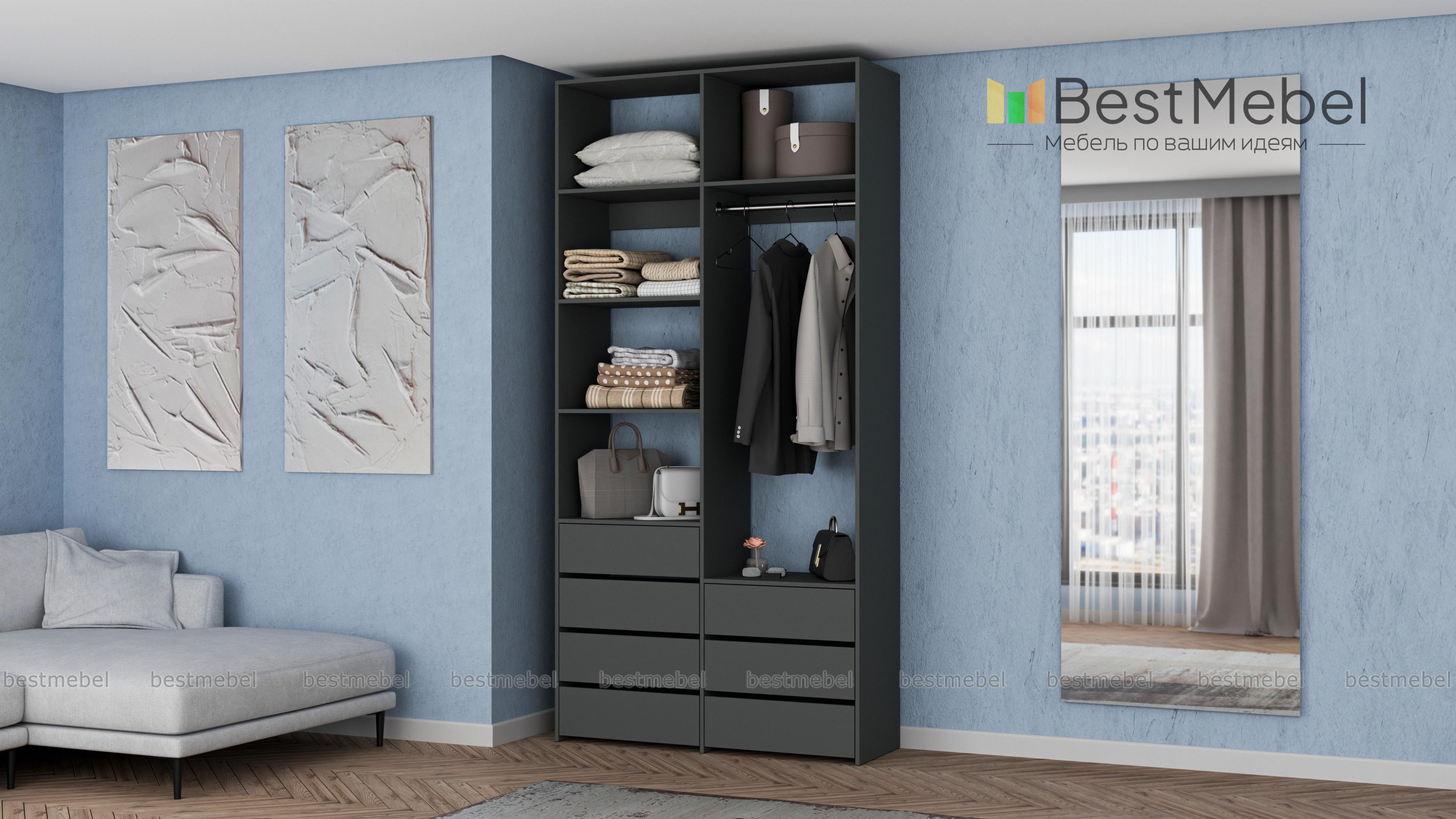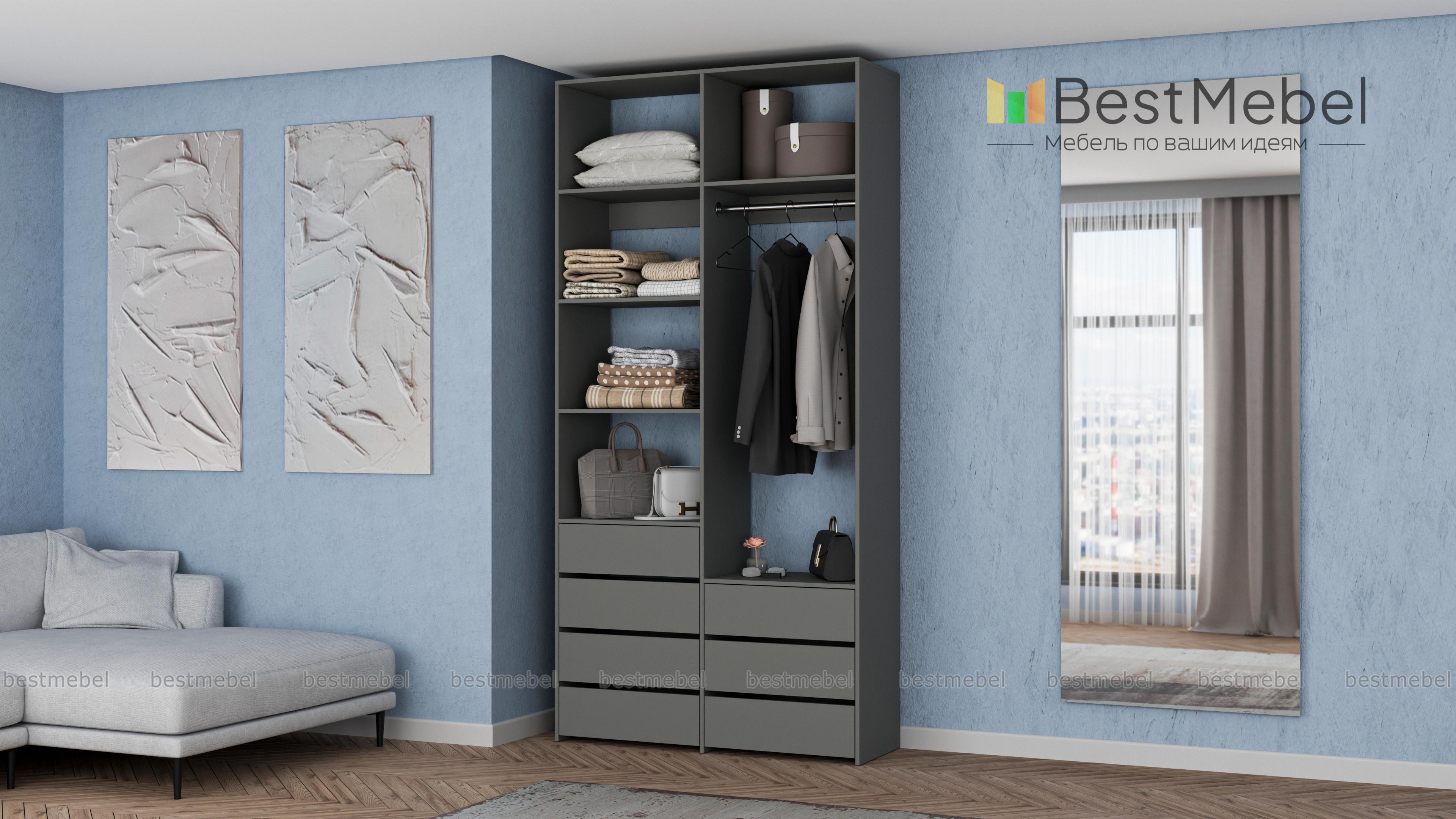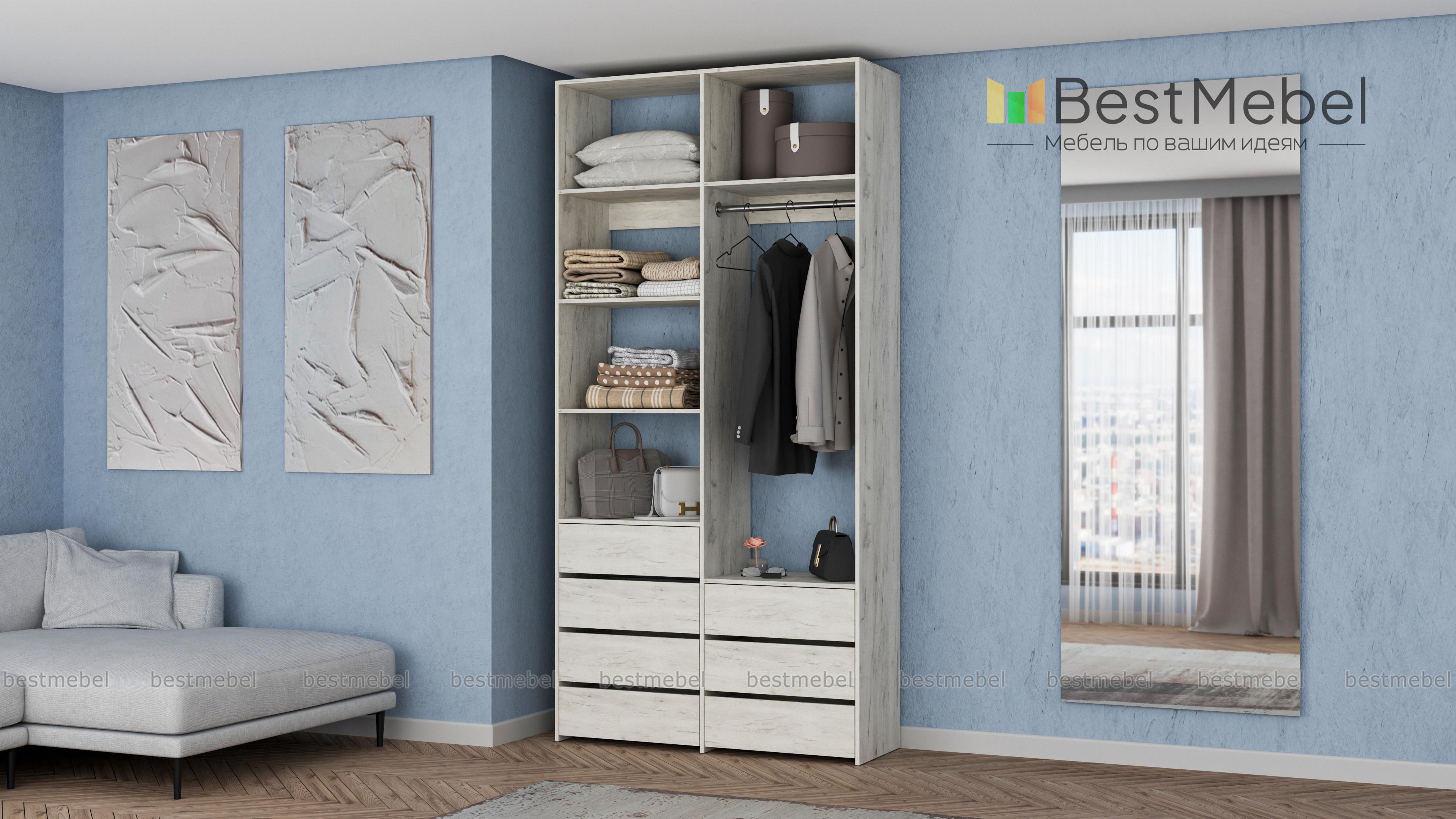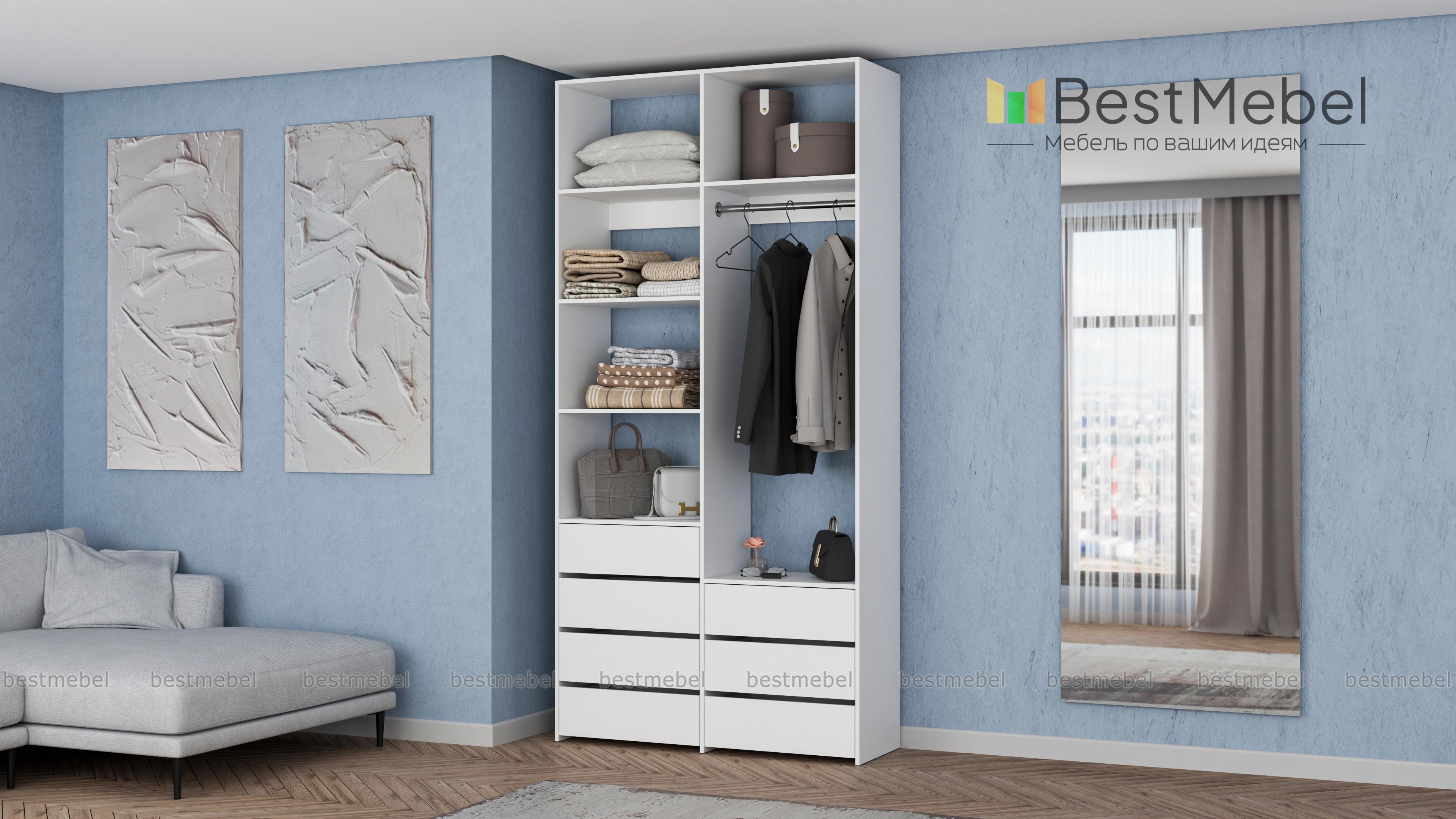Стеллаж для одежды Мирта 41 BMS позволит вам зонировать пространство для хранения. Компактная двухсекционная конструкция разделена на отсек для вешалок, бельевые полки и два ряда выдвижных ящиков — под аксессуары, трикотаж и другие мелкие вещи. Для простого функционального дизайна стеллажа оптимально подходит светлый базовый оттенок. Купить стеллаж для одежды Мирта 41 BMS вы всегда сможете на сайте нашего интернет-магазина, по желанию изменив цвет и размеры.