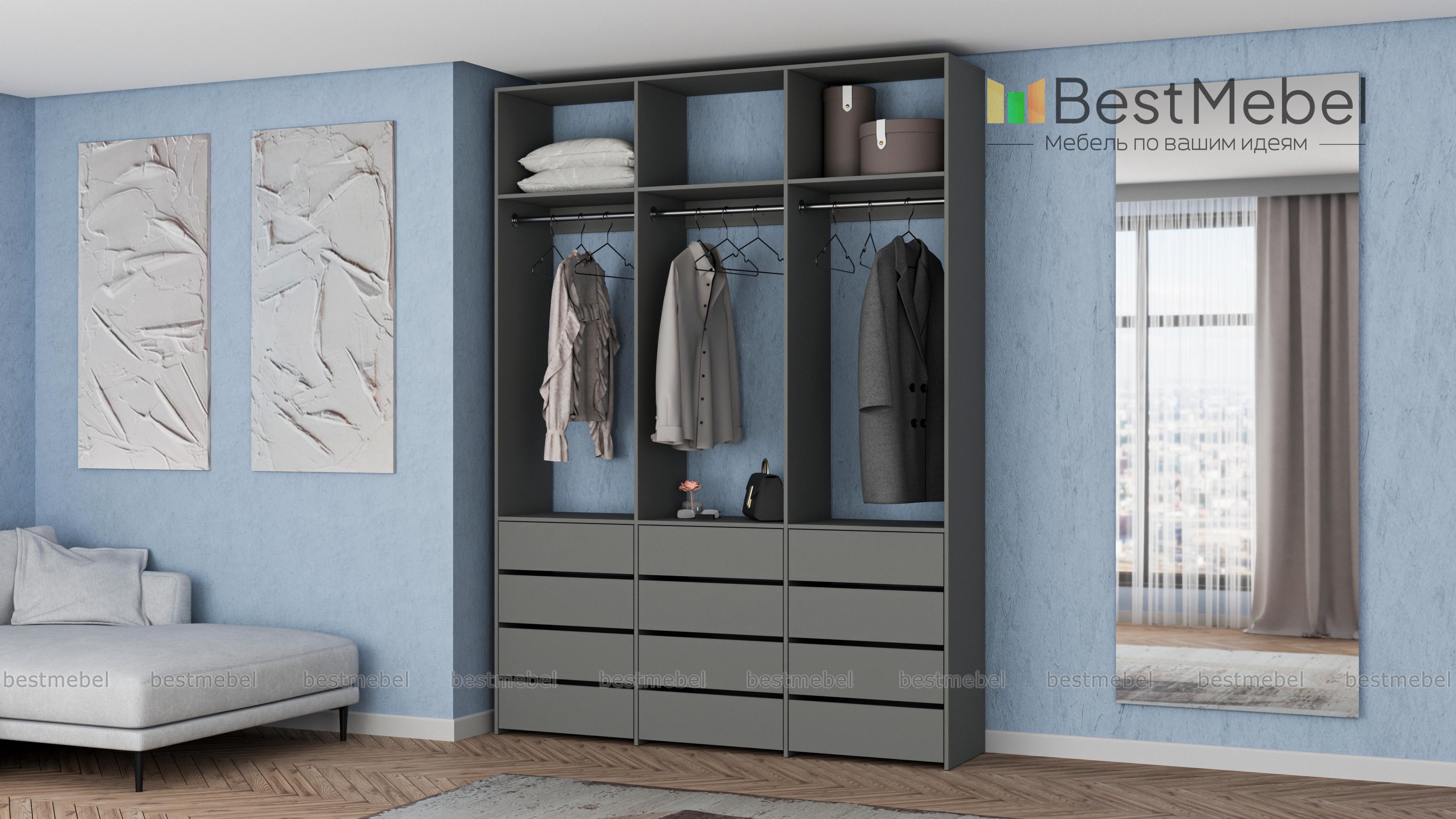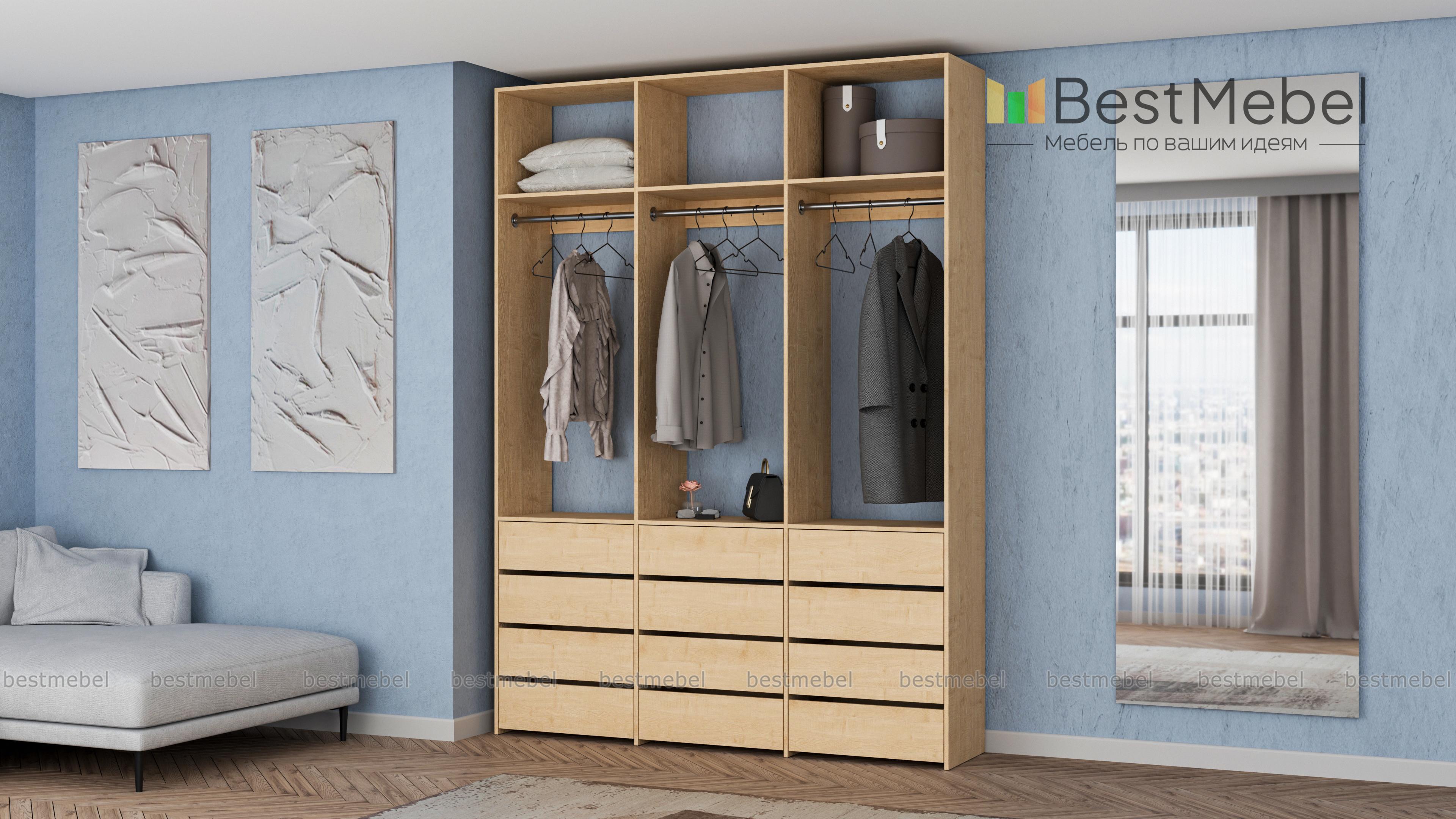 Стеллаж для одежды Мирта 47 BMS выполнен из прочной ламинированной ДСП и включает в себя три секции. В нижней части располагаются выдвижные ящики для текстиля и аксессуаров, средняя занята платяными штангами, а верхняя — полками для несезонных вещей. Минималистичный дизайн позволяет стеллажу легко вписаться в существующий интерьер. Купить стеллаж для одежды Мирта 47 BMS, изготовленный по индивидуальным размерам, вы сможете в нашем интернет-магазине.