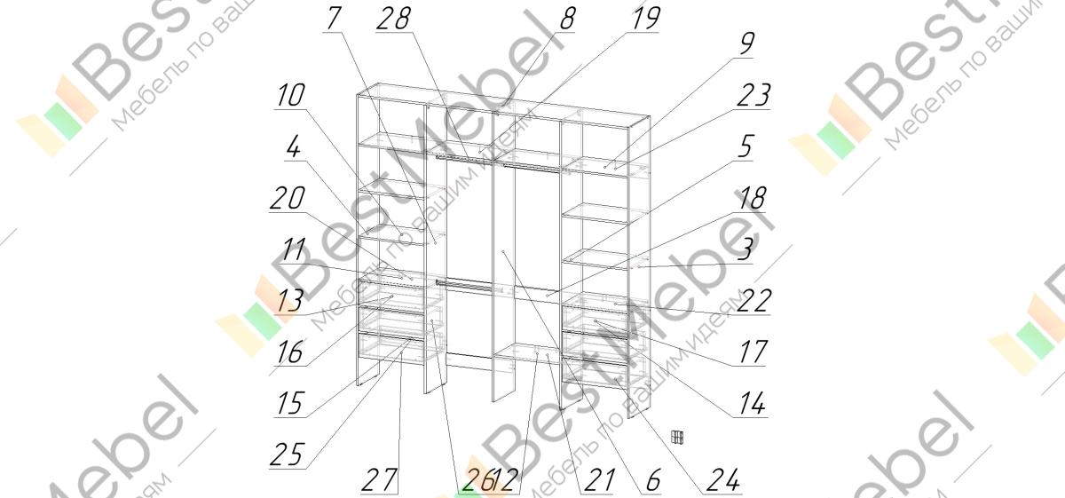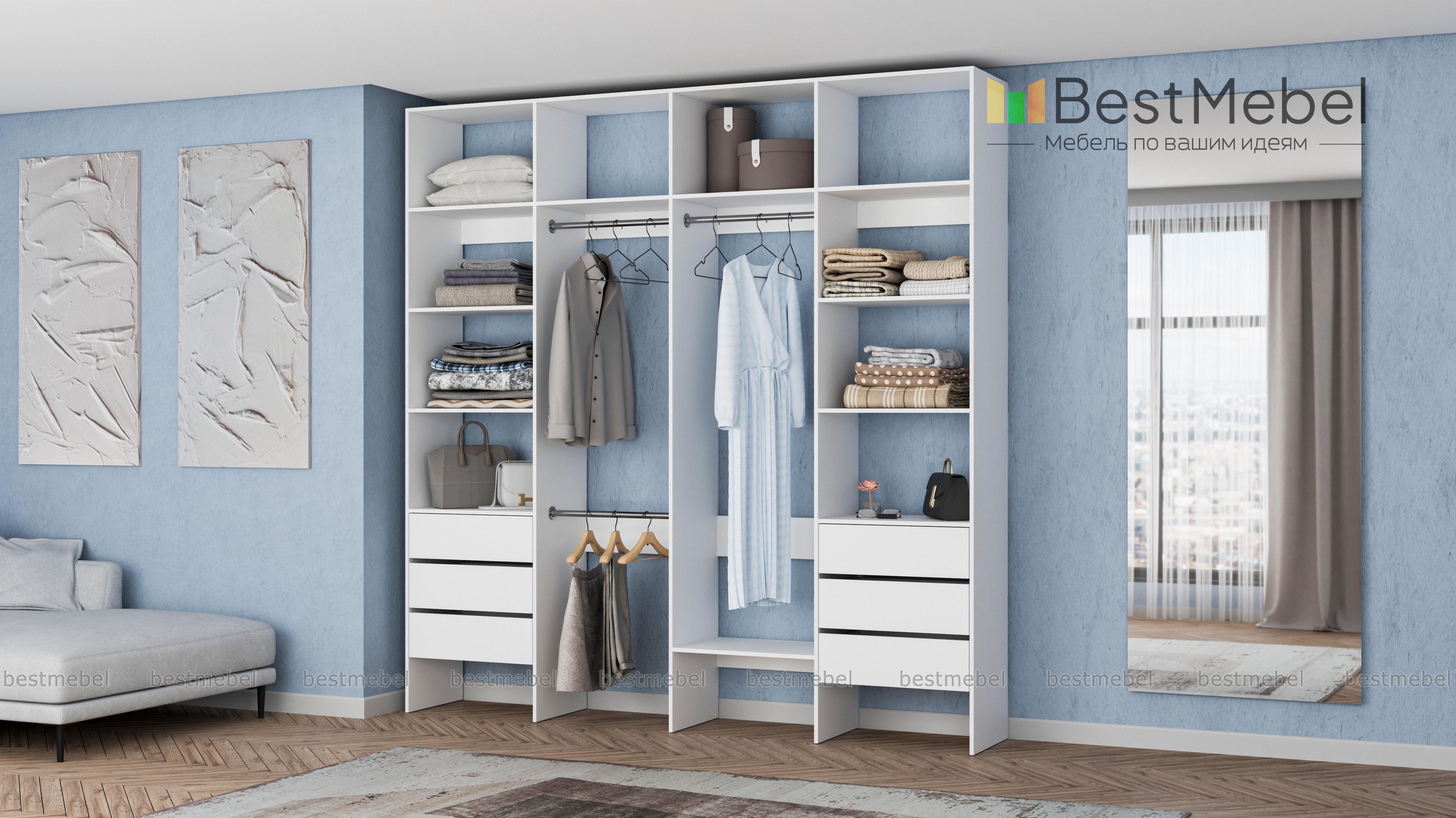 Стеллаж для одежды Мирта 65 BMS поможет легко сохранить порядок в гардеробной и входной зоне. Для компактного и аккуратного размещения вещей в стеллаже предусмотрены штанги, расположенные на двух уровнях, боковые и верхние полки, а также два ряда выдвижных ящиков. Качественная ламинированная ДСП гарантирует простоту ухода и долгий срок службы. Купить стеллаж для одежды Мирта 65 BMS, изготовленный по индивидуальным размерам, можно на сайте нашего интернет-магазина.