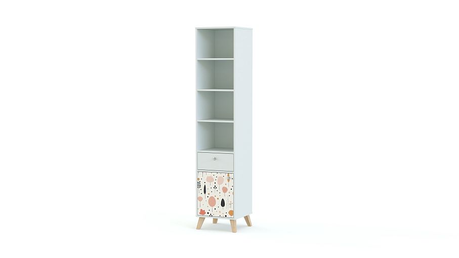 Стеллаж Эльза 5 BMS поможет в обустройстве рабочей или игровой зоны в детской. Модель со скошенными деревянными ножками оборудована тремя полками для книг и игрушек, выдвижным ящиком для мелочей и нижним отделением с распашной дверцей. Для отделки корпуса и фасада выбраны нейтральные светлые оттенки, эргономичная фурнитура и стильный рисунок-фотопечать. Купить стеллаж Эльза 5 BMS, изготовленный по вашим размерам, вы сможете на сайте нашего интернет-магазина.