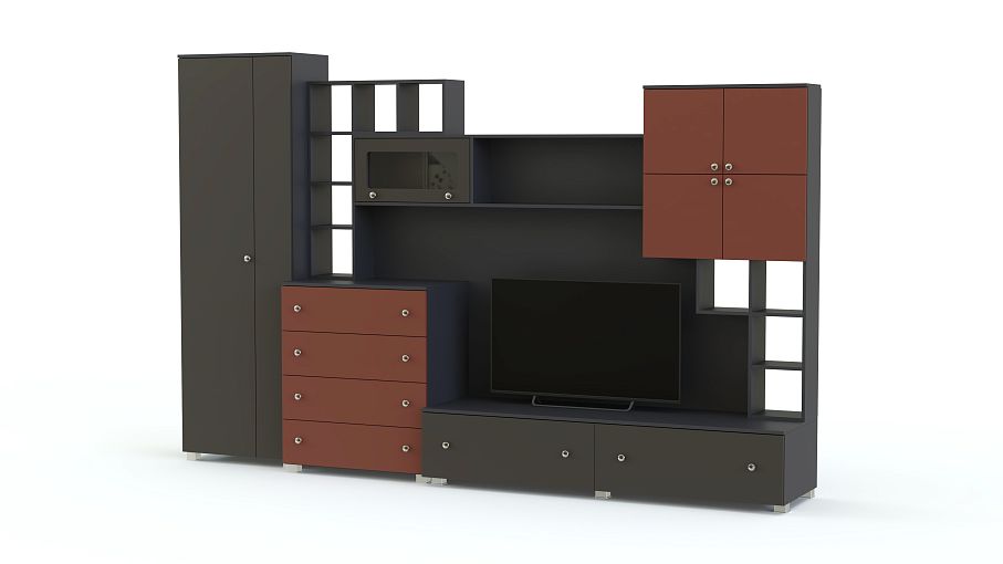 Гостиная Хай-Тэк-19 Набор 7 BMS предназначена для просторных помещений в современном стиле. Визуально легкая за счет большого количества открытых секций и комбинации разноуровневых элементов, модель оригинально оформит зону ТВ, разместит одежду, домашний текстиль, книги и декоративные предметы. В оформлении фасадов распашного шкафа, комода, тумбы и антресольных шкафов и полок сочетаются матовые темно-серые поверхности и яркий терракотовый. Купить гостиную Хай-Тэк-19 Набор 7 BMS приглашаем в наш интернет-магазин.