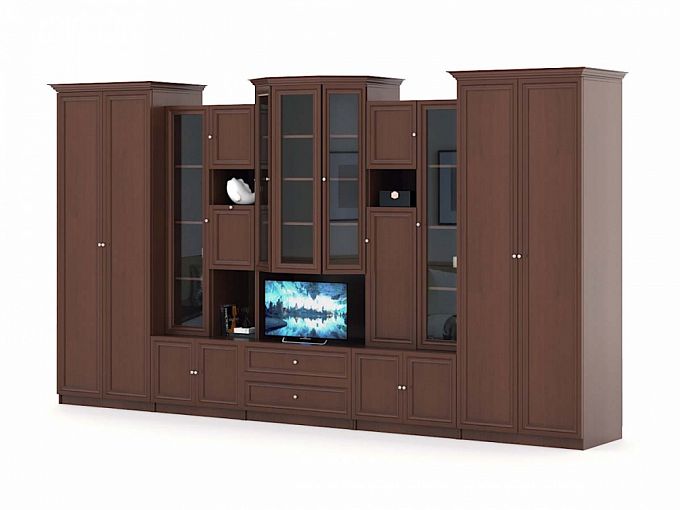 Стенка Марсель NEW BMS - стенка, которая отличается солидными габаритами и элегантным классическим дизайном, который оценят поклонники традиционного уюта. Модель не только эффектна, но и отличается вместительностью. В комплекте два двухдверных шкафа для одежды, изящные витрины с решетками, выдвижные отделения, распашные ящики и ниши. Вы с легкостью разместите предметы гардероба, книги, интерьерные украшения и множество бытовых мелочей, разгрузив другие помещения дома. Купить стенку Марсель NEW BMS по лучшей цене вы всегда сможете в нашем интернет-магазине.