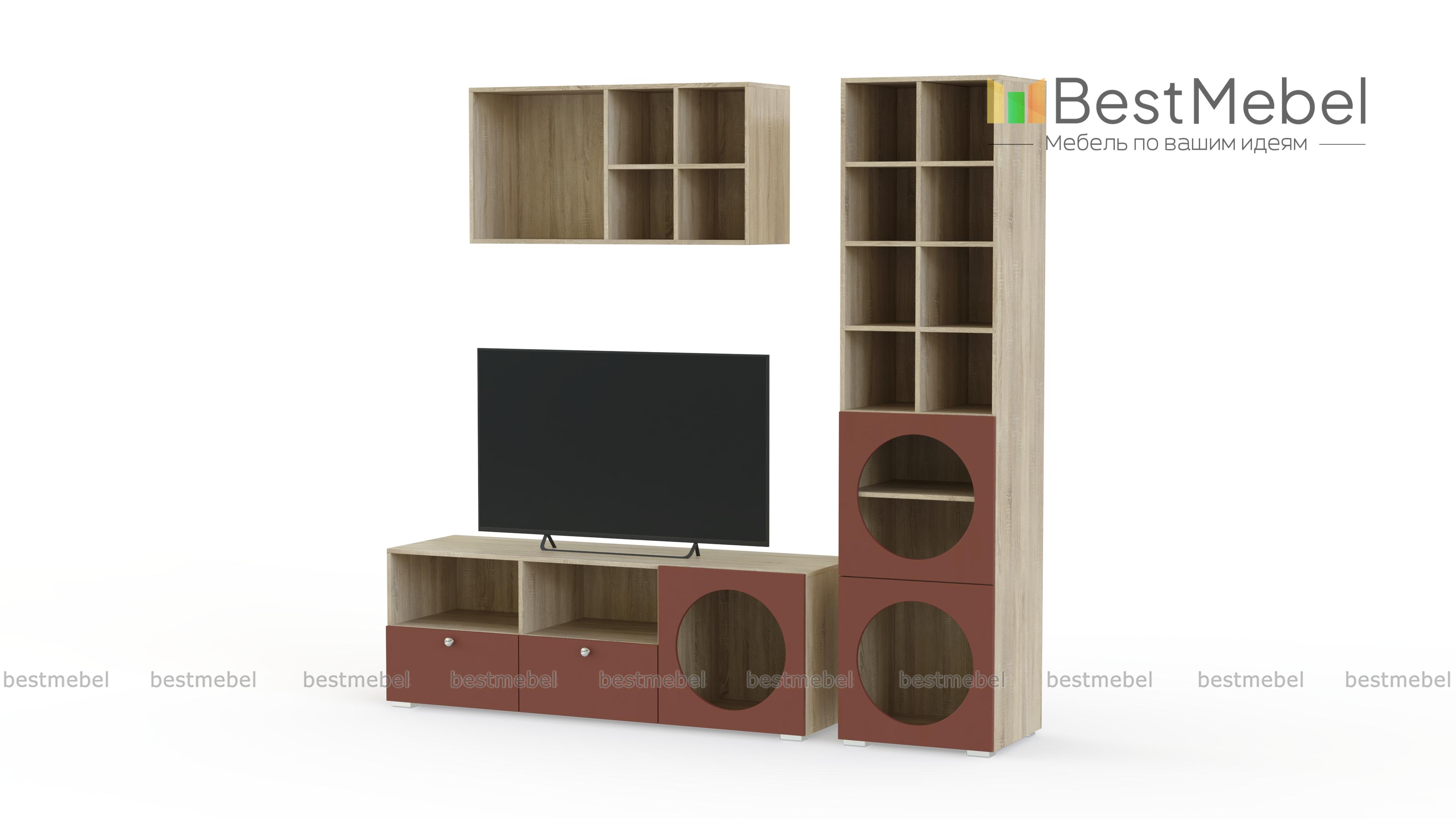 Стенка для гостиной Авелин 3 BMS с открытыми круглыми полками поможет оформить комнату в современном стиле. Модульная композиция состоит из ТВ-тумбы, высокого книжного стеллажа и навесной полки, которые комбинируются по вашему вкусу. Благодаря использованию качественных материалов стенка сохранит эстетичный вид на долгие годы. Купить стенку для гостиной Авелин 3 BMS вы сможете в нашем интернет-магазине в необходимом размере и любых оттенках из каталога.