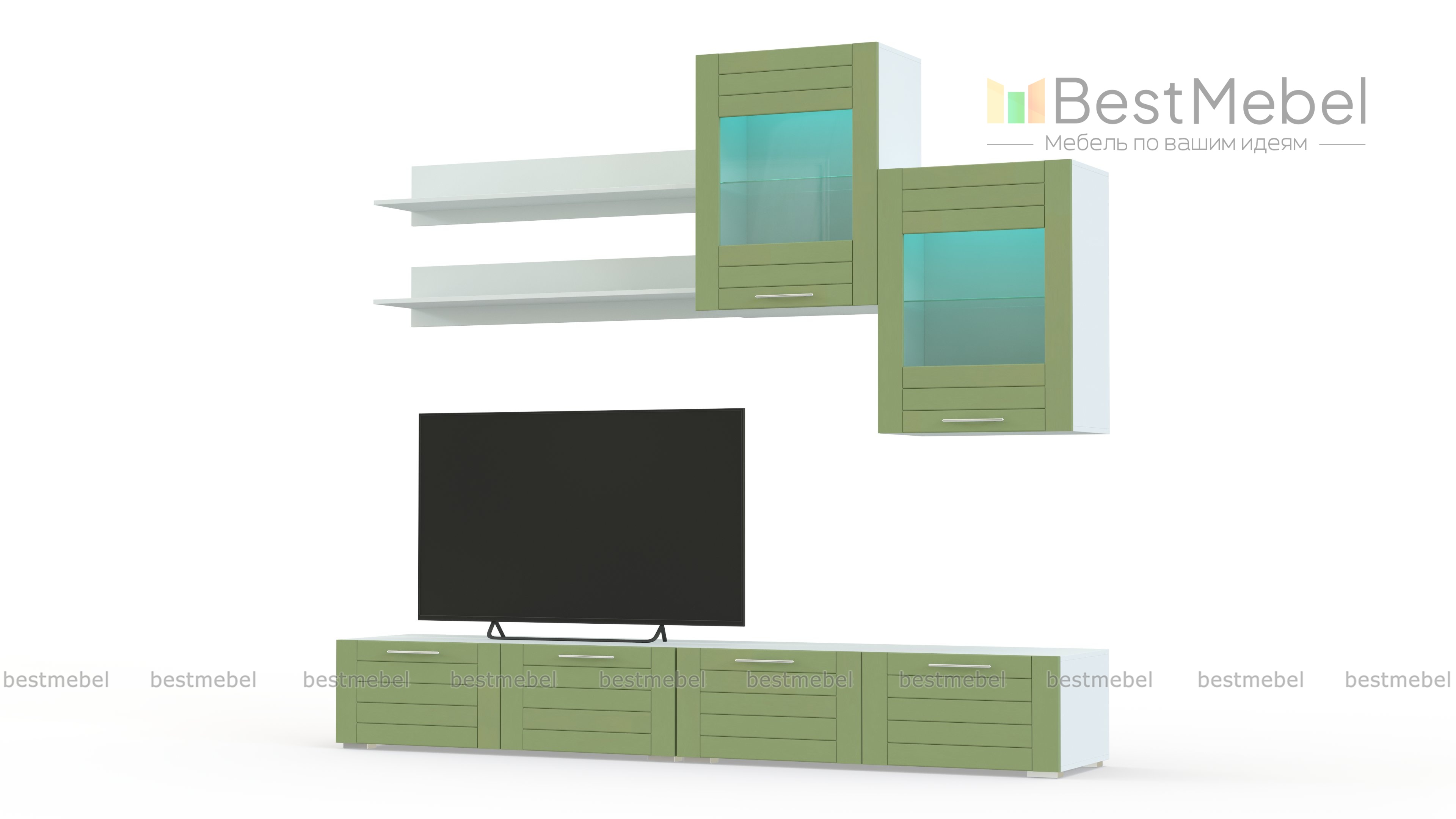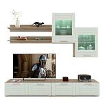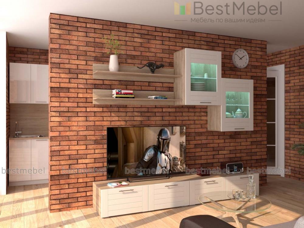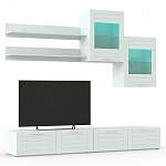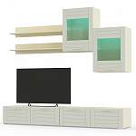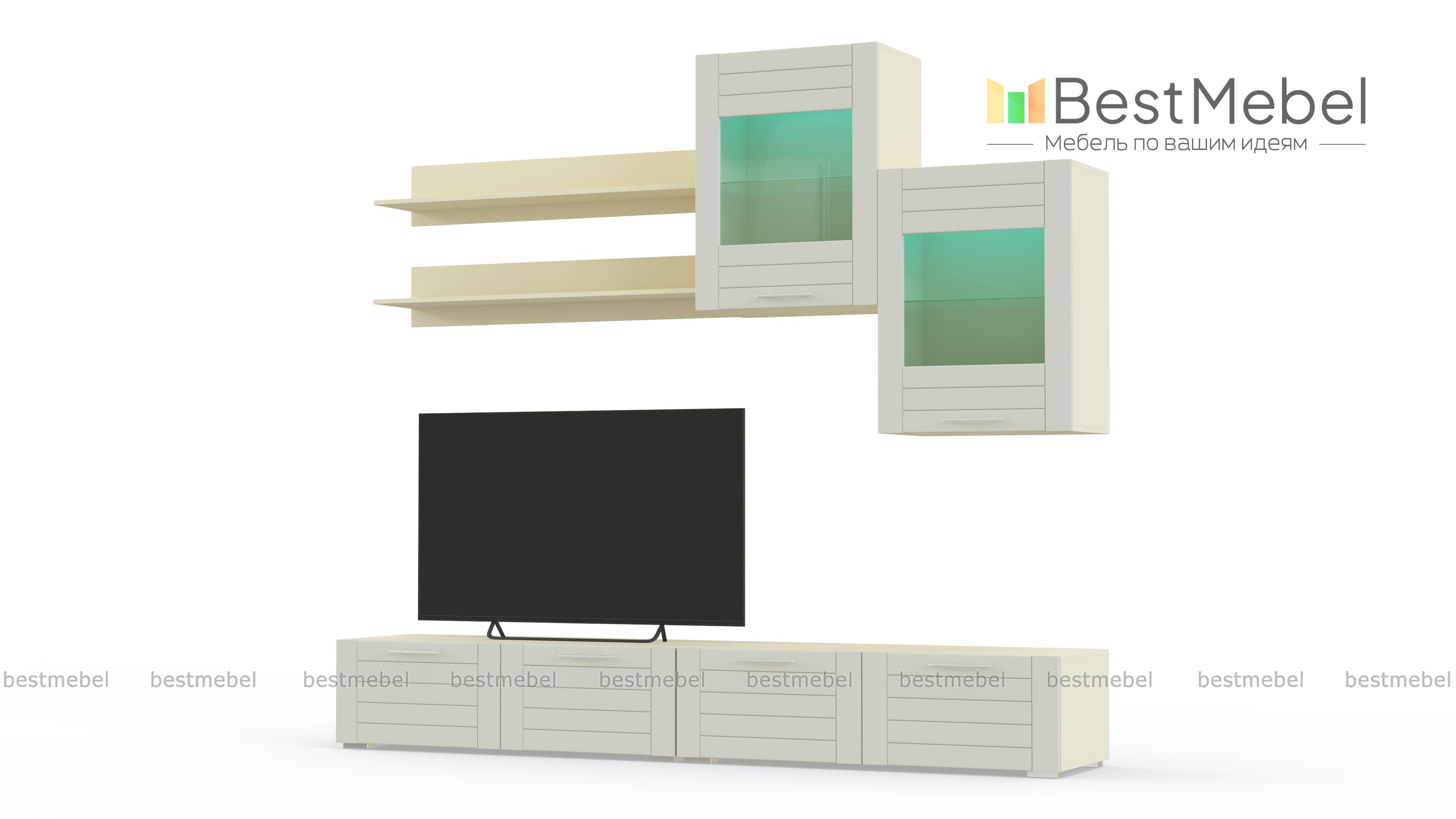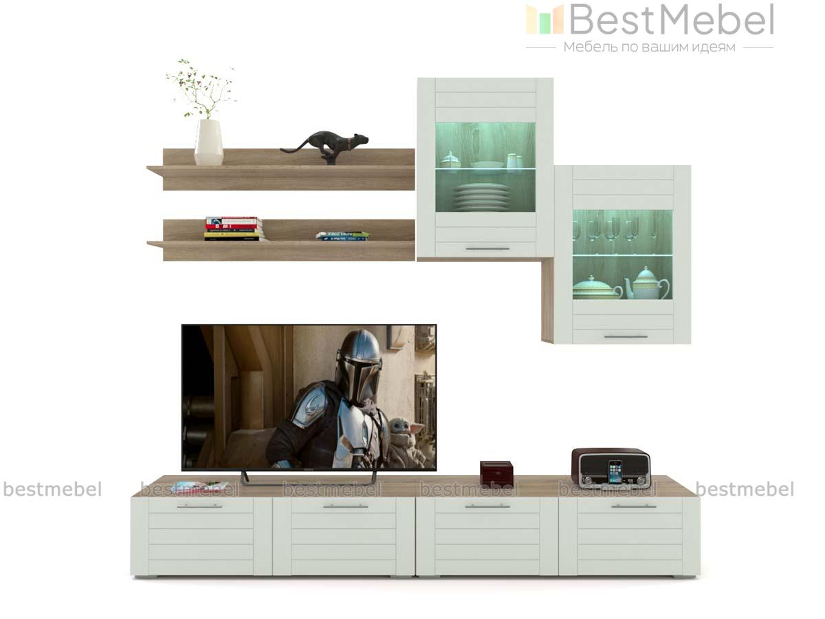 Стенка Тирамису 3 BMS – стильная альтернатива громоздкой мебели в интерьере небольшой гостиной. Модульная композиция поможет оформить телезону, разместив аппаратуру, книги, декоративные предметы и сопутствующие аксессуары. В комплект входят две широкие низкие тумбы, навесные витрины с подсветкой и открытые полки. В оформлении скомбинированы белый корпус и матовые фасады с фрезеровкой. Купить стенку Тирамису 3 BMS и создать комфортное, визуально легкое пространство вам поможет наш интернет-магазин.