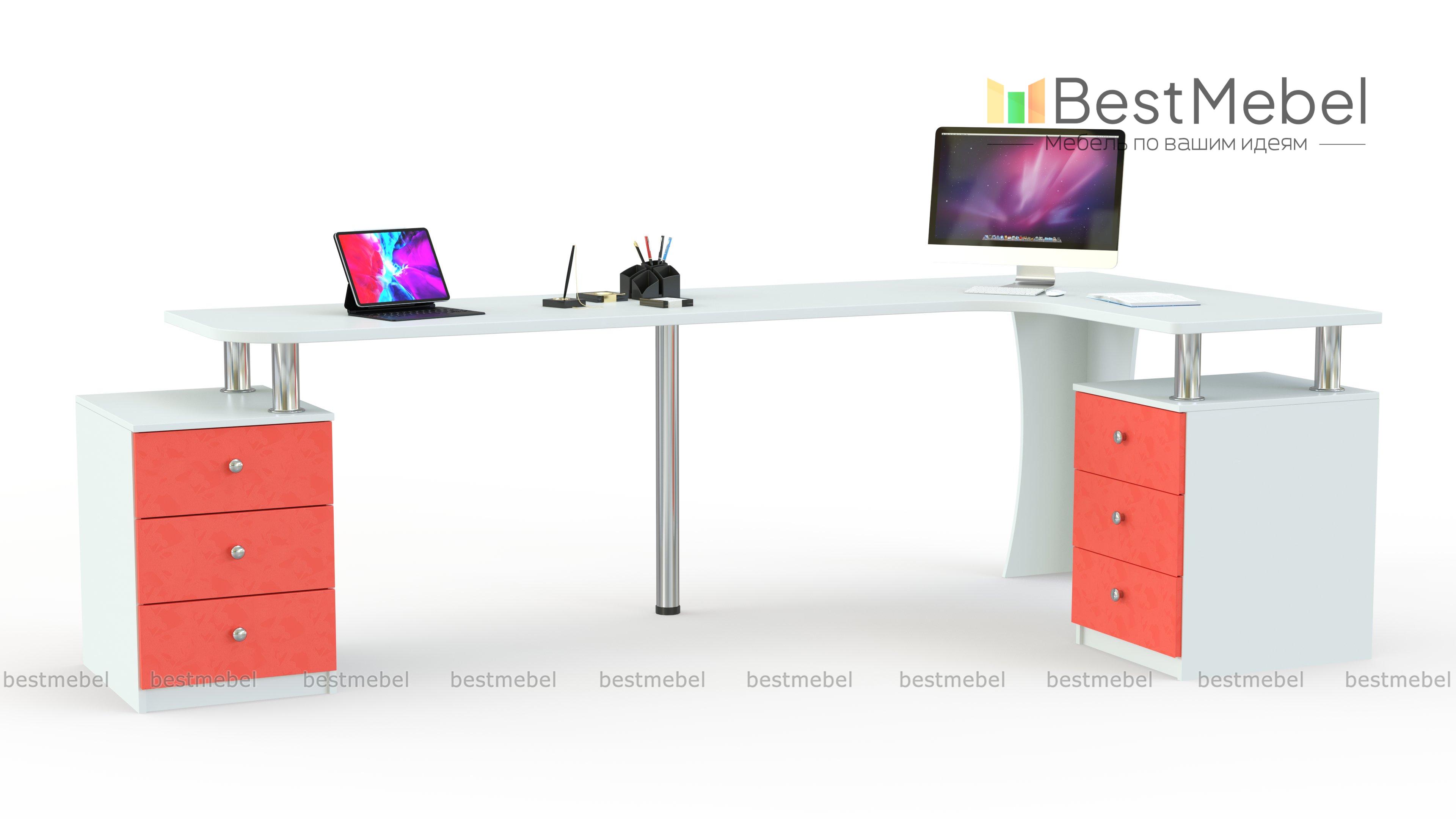 Угловой письменный стол для двоих Колор 58 BMS легко впишется в интерьер современной детской и сэкономит полезную площадь для активных игр. Модель оборудована широкой, безопасно скругленной по углам столешницей, опирающейся на две тумбы с выдвижными ящиками для канцелярских мелочей и регулируемую стойку. Корпус черного цвета дополняют цветные яркие фасады с ручками-кнопками. Купить угловой письменный стол для двоих Колор 58 BMS по доступной цене вы сможете в нашем интернет-магазине.