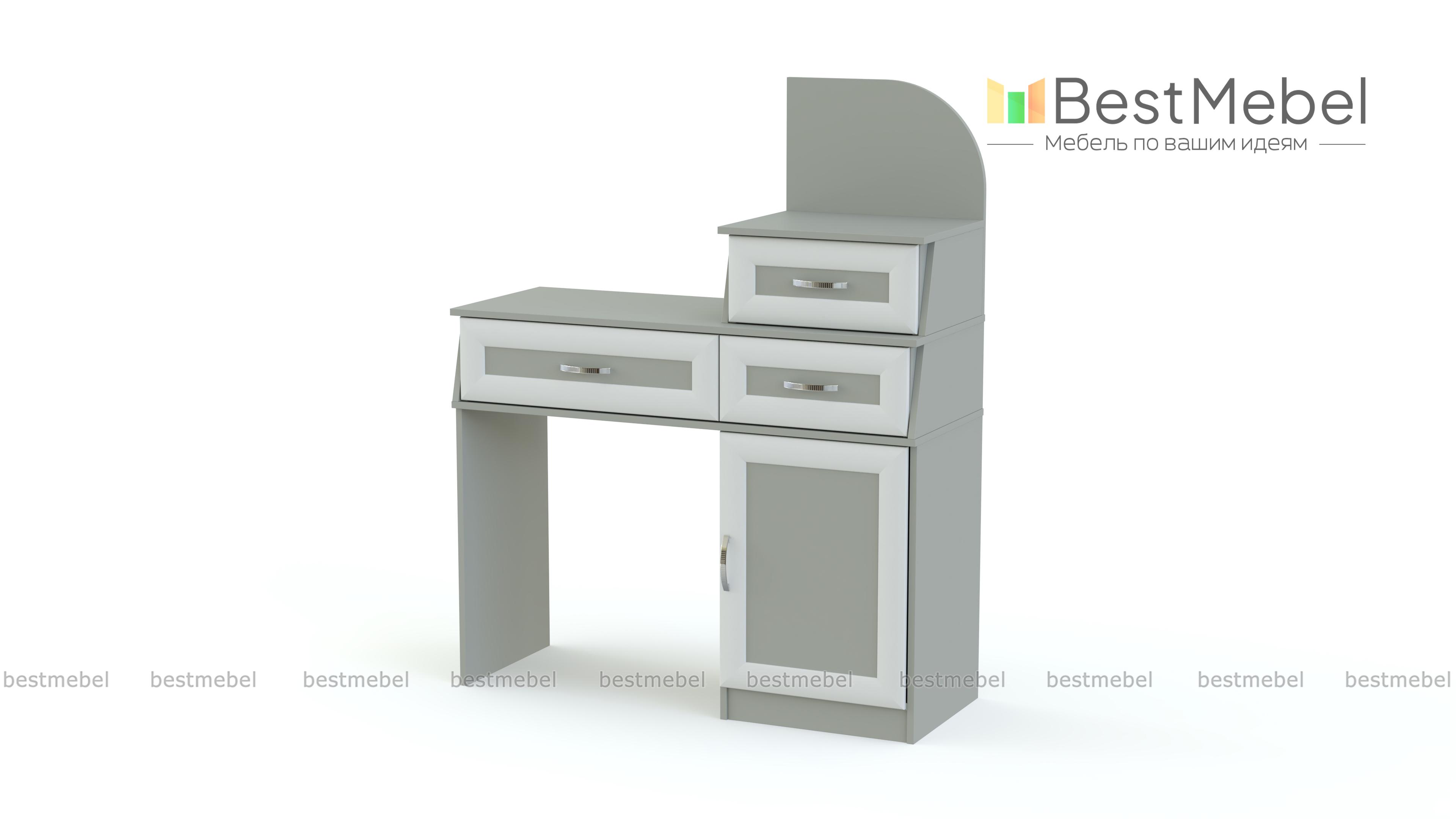 Трюмо без зеркала BMS выполнено в классическом стиле и станет незаменимым элементом меблировки спальни или прихожей. Фасады компактной модели декорированы рамками и изящными ручками-скобами, расцветка – богатая палитра оттенков на выбор. Трюмо представляет собой единую композицию из выдвижных ящиков и распашного отделения. На столешнице располагаются дополнительный выдвижной ящик для украшений и аксессуаров и открытая полочка. Купить Трюмо без зеркала BMS недорого приглашаем к нам в интернет-магазин.