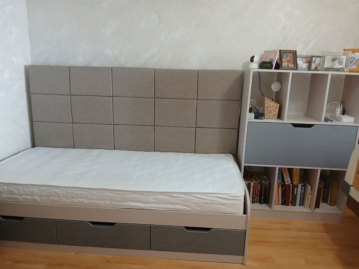 Модуль шкафа с полками отдельный. В итоге поставили его сбоку от кровати, т.к. если ставить между кроватью и стенкой, то к нижним полкам нет доступа. Поэтому пришли к выводу, что проще было бы купить отдельно кровать и отдельно шкаф с полками. Вышло бы дешевле и можно было бы шкаф заказать с большим количеством полок. В остальном всё устроило. Ящики под кроватью - супер удобно.