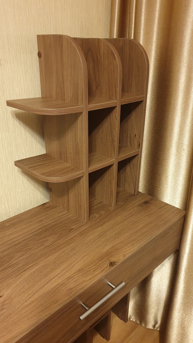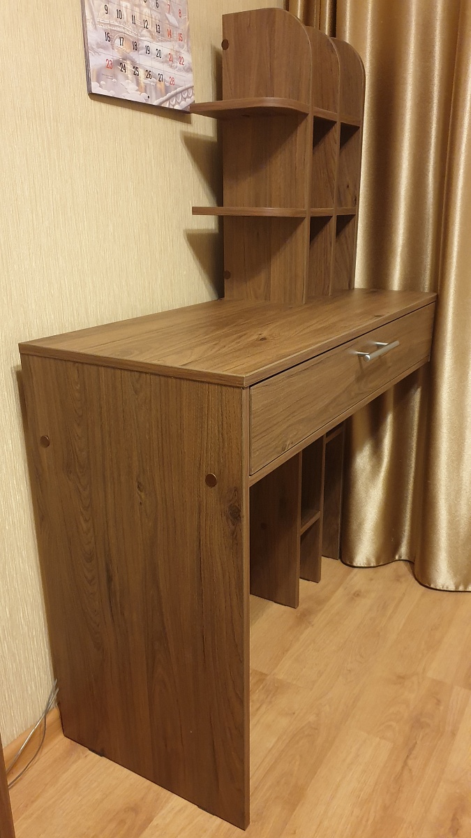 Стол хороший, требует крепления к стене и слишком громоздко смотрятся верхние полочки, их надо делать не такие глубокие, пожалела, что согласилась на усиление дна ящика(думала, что будет фанера потолще) а из ЛДСП уменьшает объём ящика. Заказ привезли в срок, все детали были пронумерованы, собрали сами без проблем