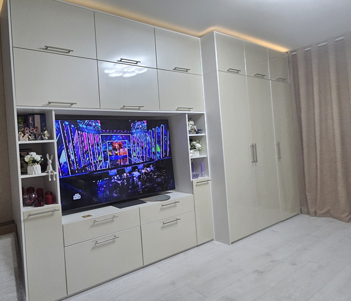 Стенкой довольны. Вместительная, красивая. Собирали сами. Были небольшие проблемы с регулированием ящиков и поменяли петли на одной двери шкафа Но в целом классная мебель.Спасибо!