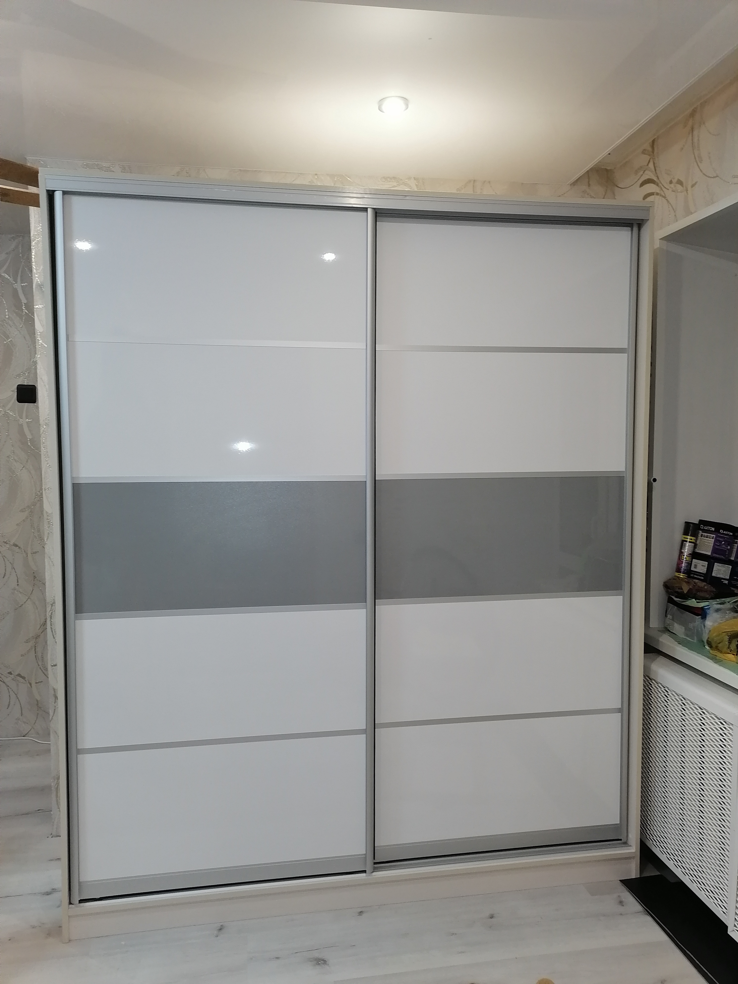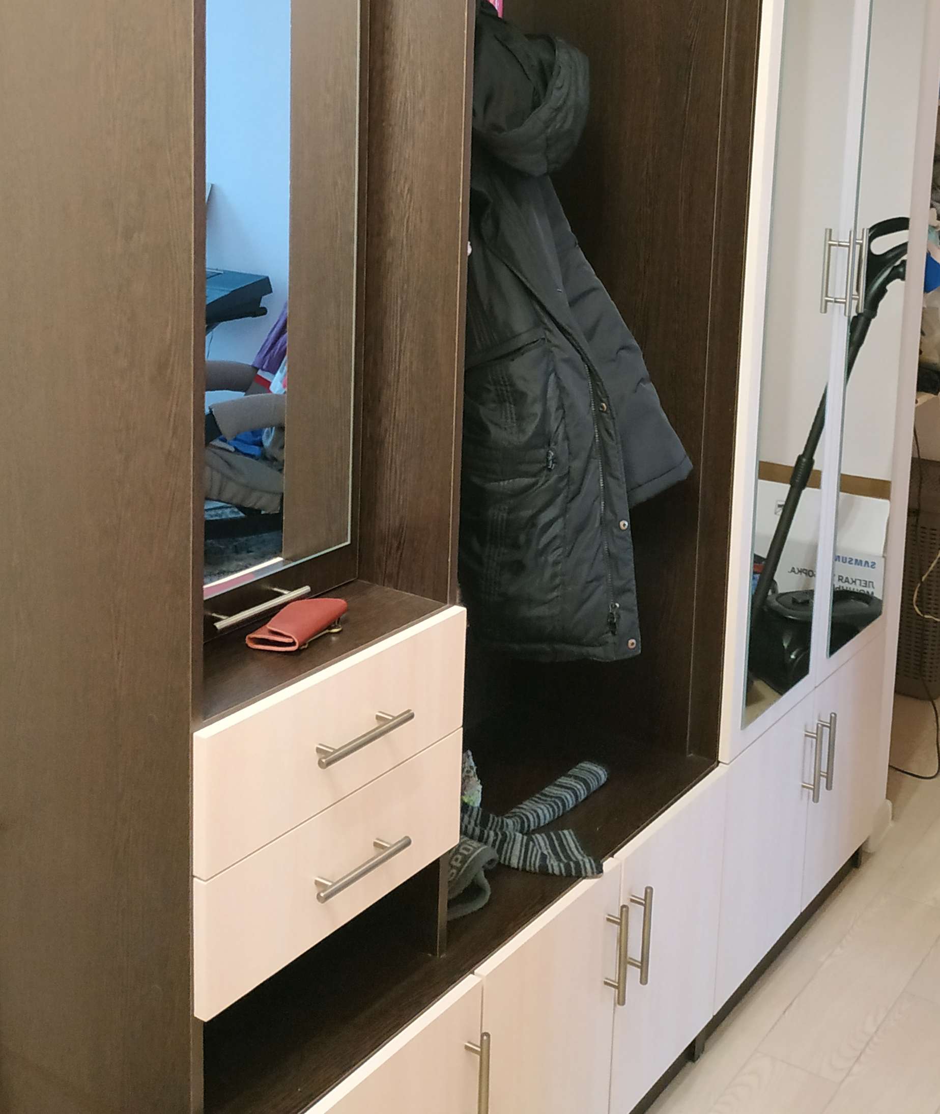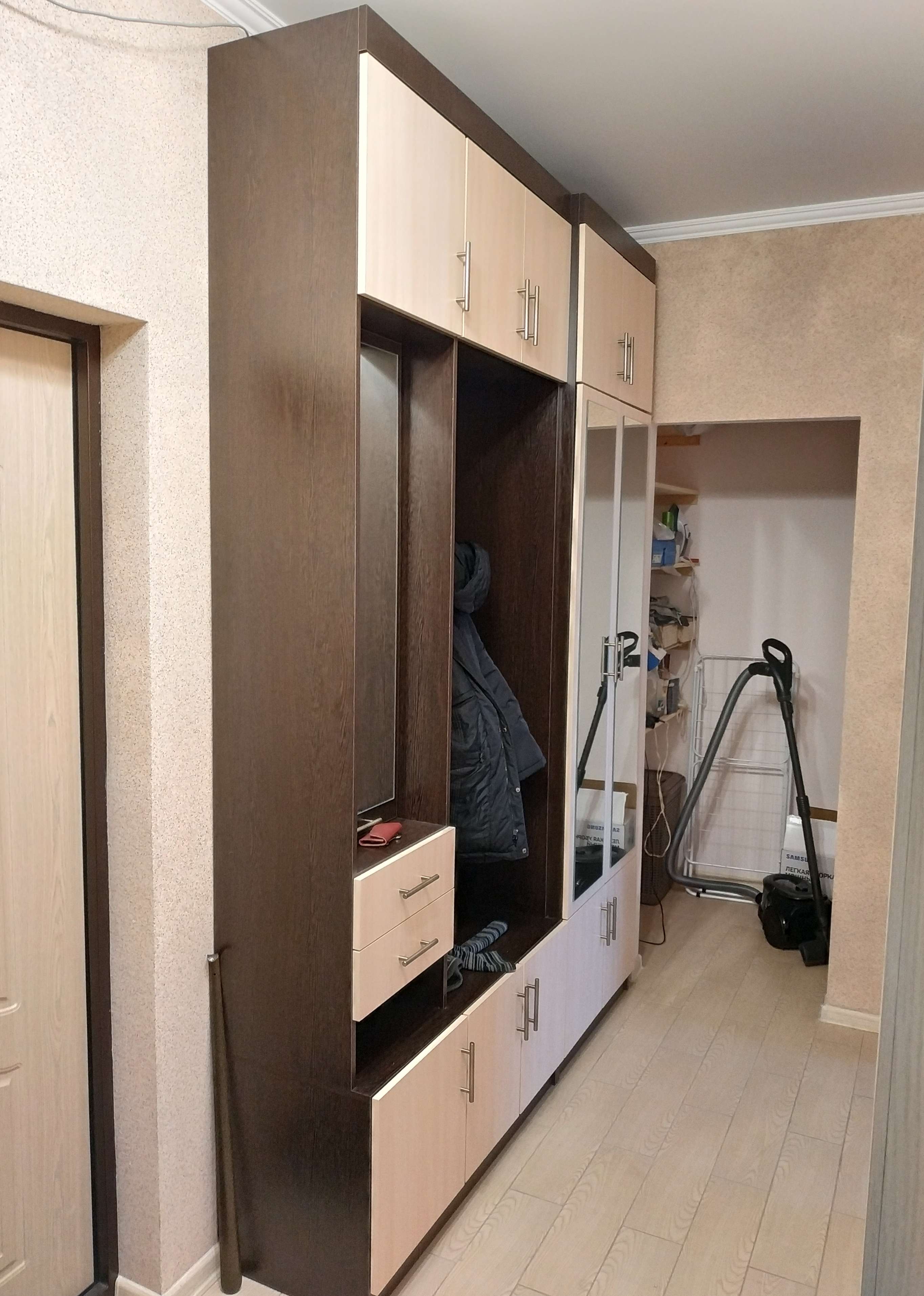 Неглубокая прихожая в узкий коридор. Заказал нестандартную высоту 2600 мм. и два зеркала на двери шкафа. Конструктивная особенность шкафа такова (а может быть это недоработка технолога), что вид с верху выглядит в виде короба глубиной 70-100 мм. Так что пыль сверху смахнуть нельзя (только собирать). В целом доволен.
