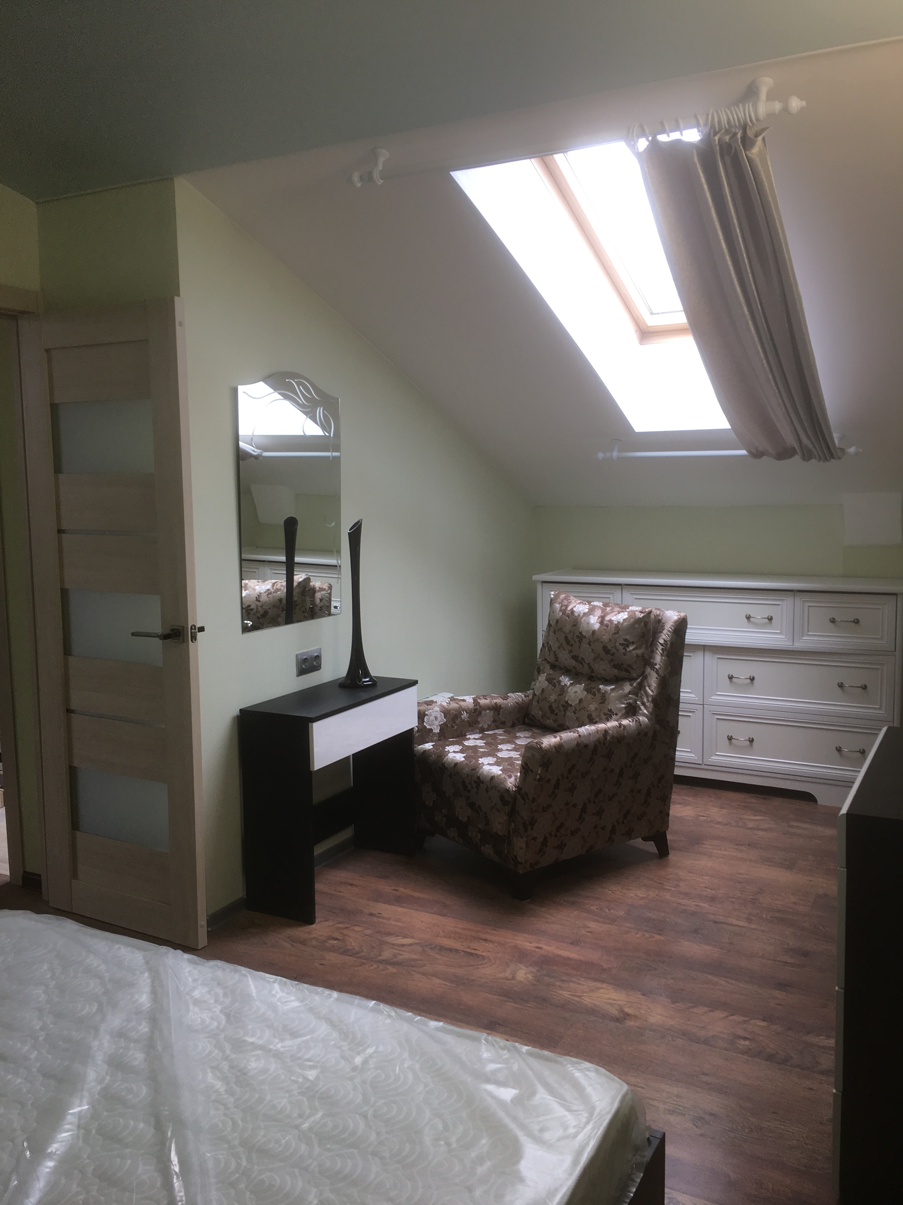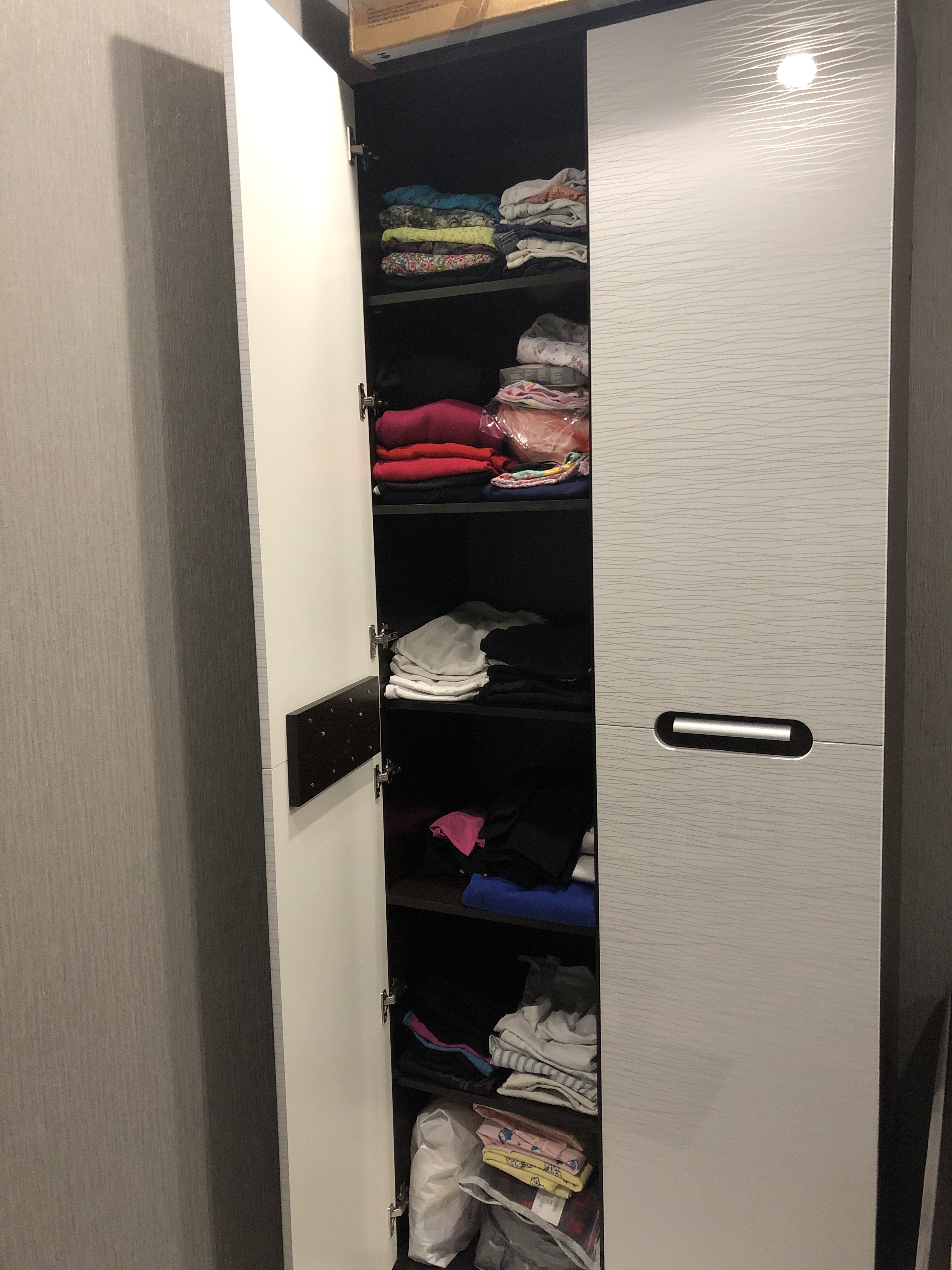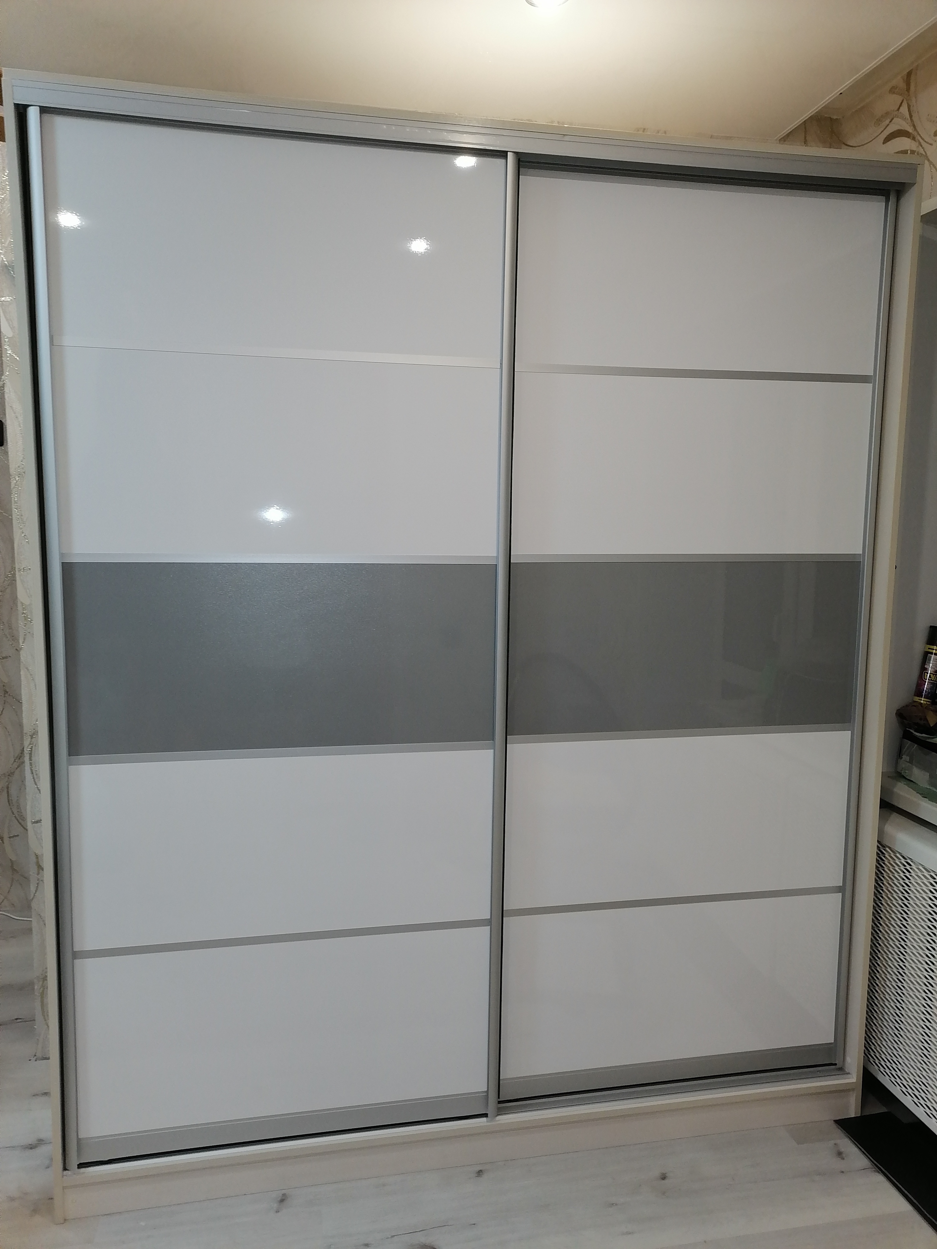 Неглубокая прихожая в узкий коридор. Заказал нестандартную высоту 2600 мм. и два зеркала на двери шкафа. Конструктивная особенность шкафа такова (а может быть это недоработка технолога), что вид с верху выглядит в виде короба глубиной 70-100 мм. Так что пыль сверху смахнуть нельзя (только собирать). В целом доволен.
